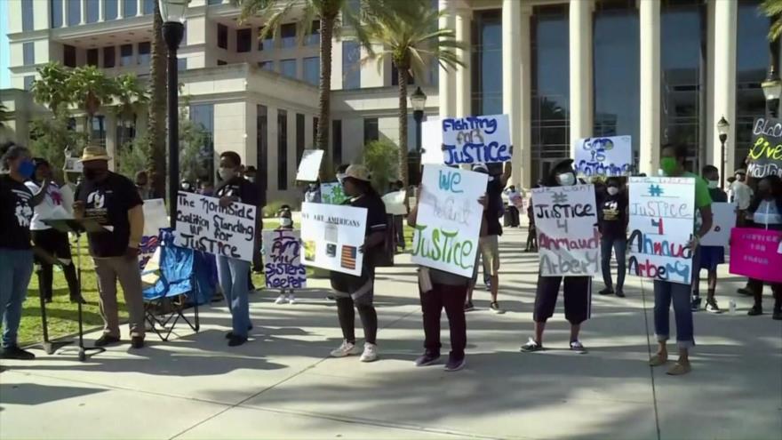 Decenas de personas se reunieron en Brunswick con pancartas en las que se leía que las Vidas Negras Importan y denunciaban la demora al detener a los autores del crimen y la publicación del vídeo del asesinato.