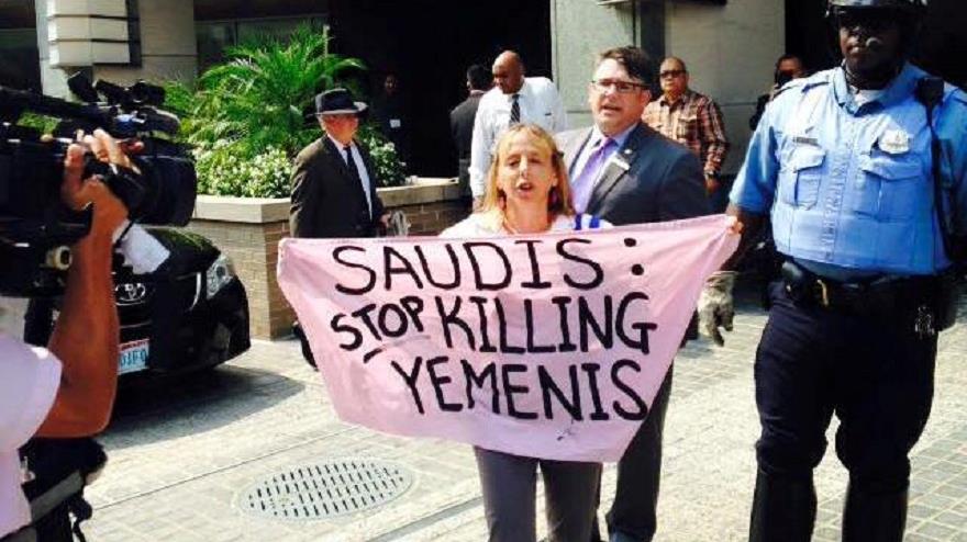 Medea Benjamin, del grupo pacifista Code Pink (Código rosa), asimismo, ha llamado al presidente estadounidense, Barack Obama, a cesar su apoyo a Arabia Saudí y la guerra contra Yemen.
