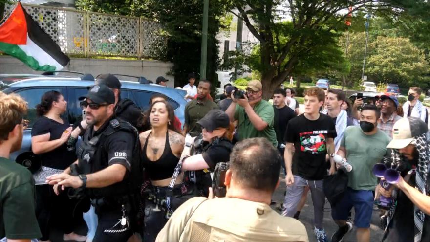 Activistas brutalizados. Bajo arresto. Policías de 2 metros de altura, empujando y golpeando a jóvenes universitarias. Esta es la reacción “normal” de la policía estadounidense y el Servicio Secreto toda vez que los colores de Palestina aparecen en escena.