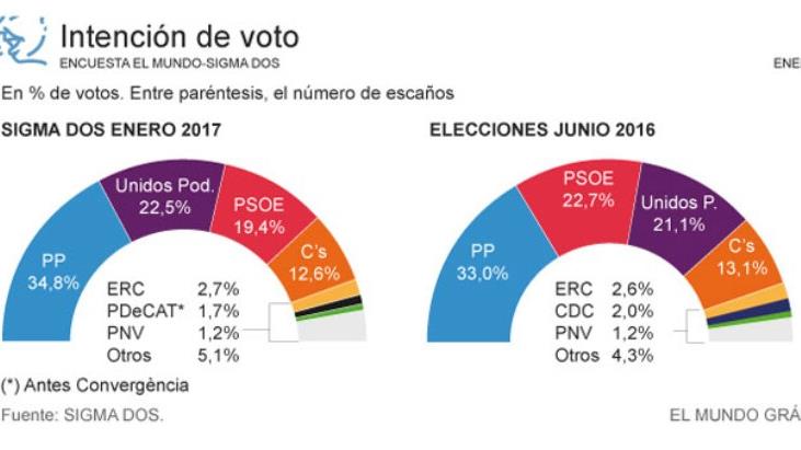 Según una encuesta de Sigma Dos para El Mundo publicada el lunes, el Partido Popular (PP) se consolida como primera fuerza política en sus dos primeros meses de gobierno con el 34,8 % de intención de voto, mientras que Unidos Podemos se sitúa en segunda posición con un 22,5 %.