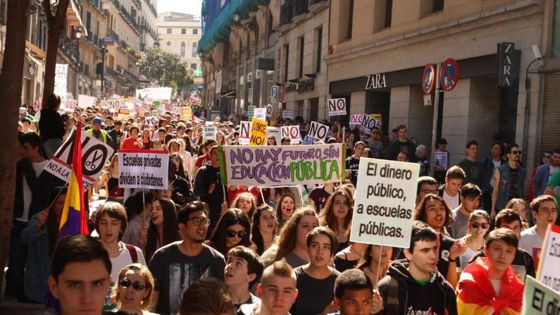 Miles de jóvenes salieron a las calles de unas cincuenta ciudades de España (Madrid, Barcelona, Valencia, Sevilla, Bilbao, Santander...) para denunciar la mala situación de las escuelas públicas, debido a la ley educativa Lomce y los recortes, que suman 9000 millones de euros desde que el Partido Popular (PP) gobierna. Algunas de las consignas reclamaban que el Gobierno realiza recortes en Educación mientras que sí decide aumentar el gasto militar.