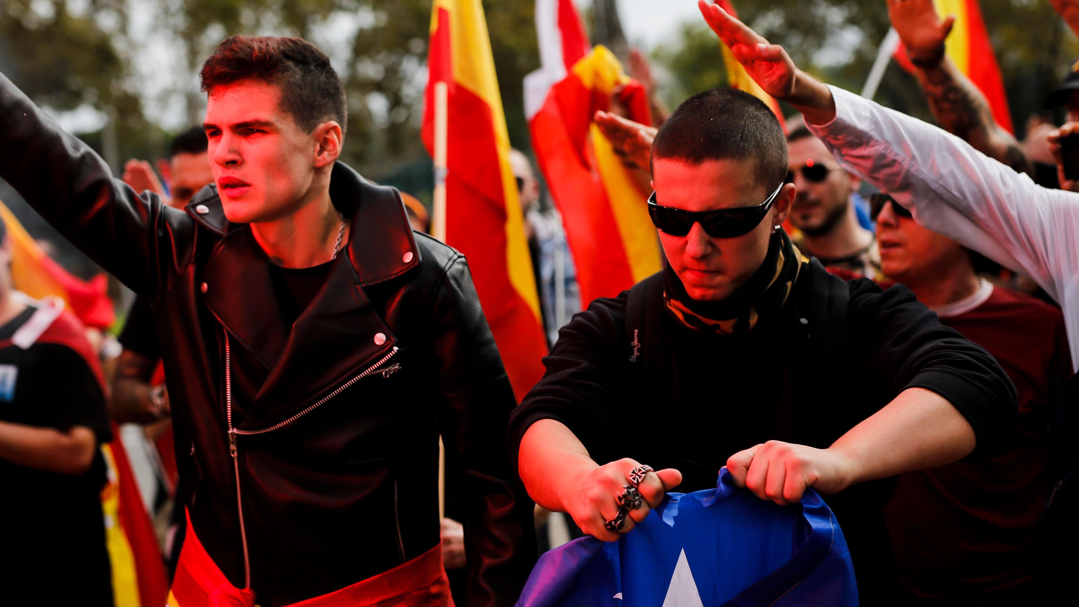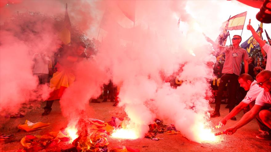 Paralelamente, unas 350 personas, según cifras del Ayuntamiento de Barcelona, han asistido a otra concentración de extrema derecha durante la cual se han quemado banderas independentistas catalanas y se han proferido consignas contra el presidente de la Generalitat (gobierno regional), Carles Puigdemont, y el mayor de Mossos d’Esquadra, Josep Lluís Trapero.