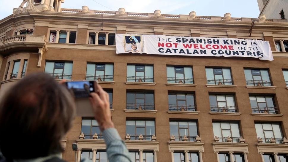 Este viernes Barcelona, capital de la comunidad autónoma de Cataluña, ha amanecido con dos pancartas anónimas para protestar contra la presencia del rey Felipe en el homenaje de las víctimas de atentados terroristas que sacudieron el año pasado el bulevar turístico de Las Ramblas en Barcelona, y la involucración de Madrid y Riad en guerras.