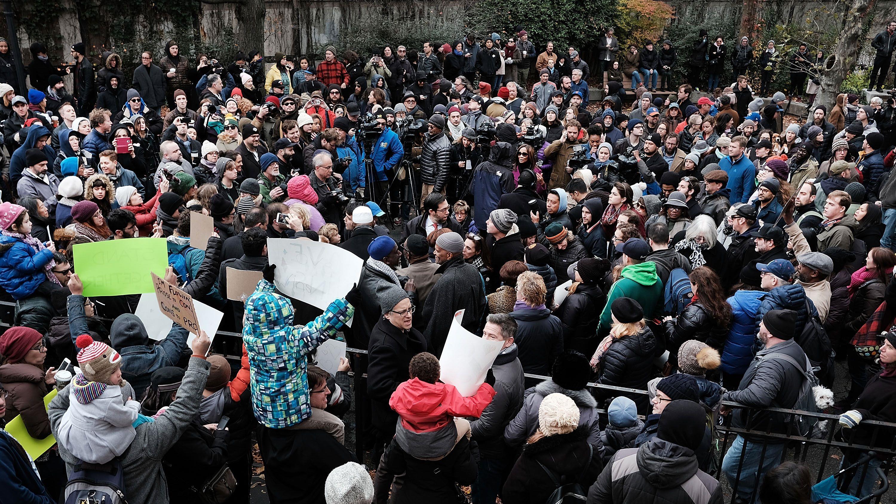 Cientos de personas, muchas con sus hijos, escucharon a líderes comunitarios y el miembro de Beastie Boys Adam Horovitz, que condenaron los crímenes de odio inspirados por la elección de Donald Trump.