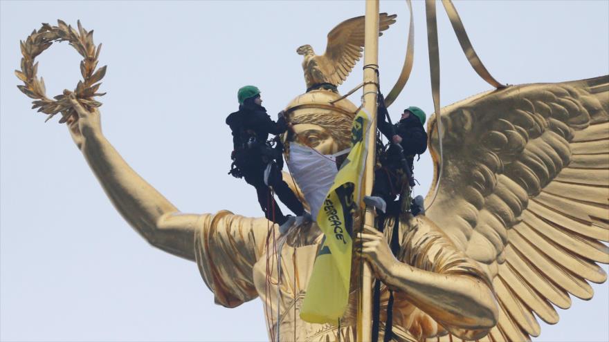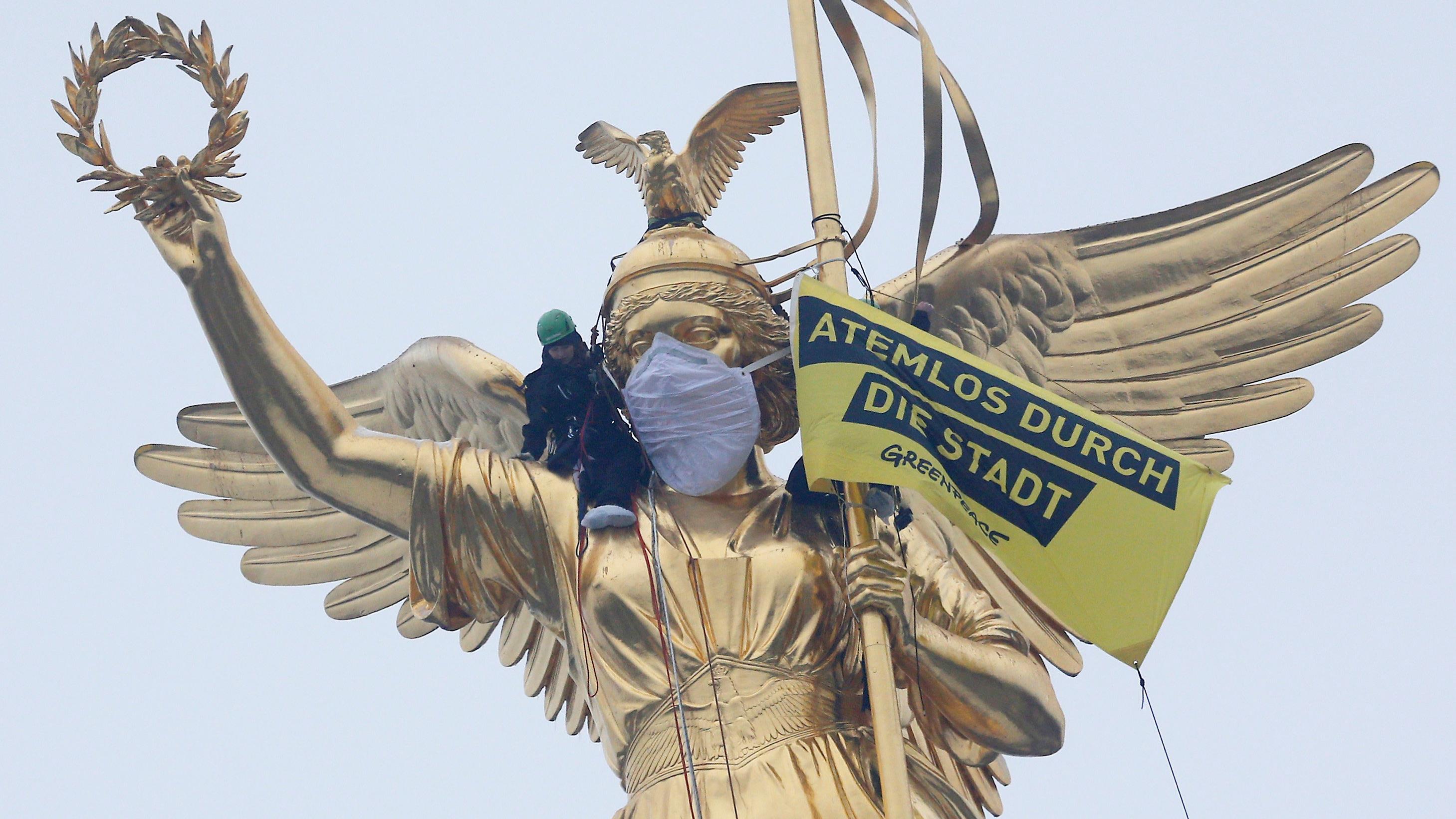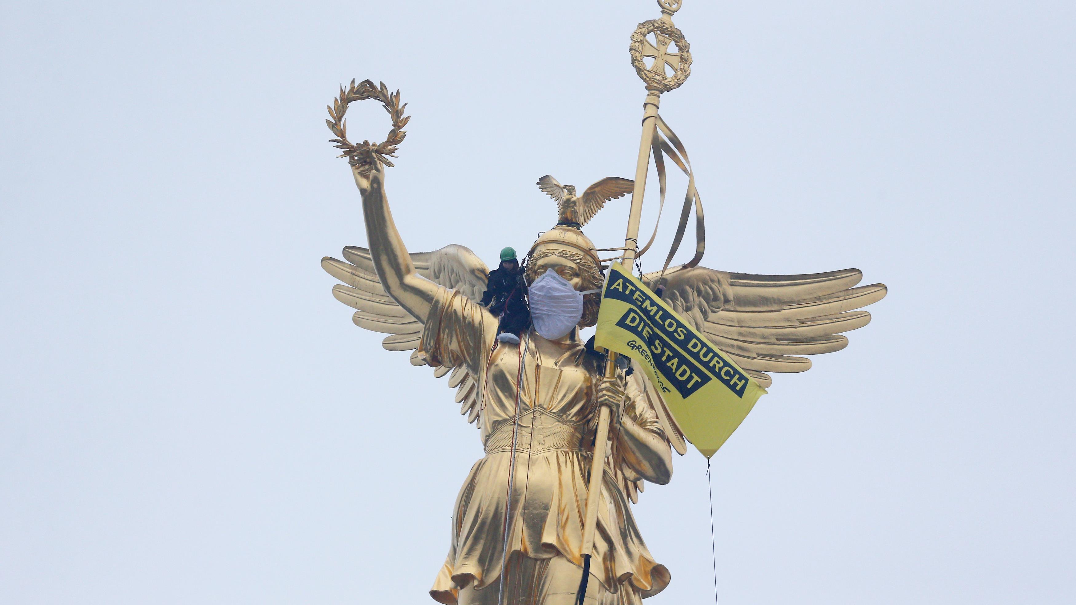 Los activistas se han subido a la emblemática Columna de la Victoria para instalar una pancarta en la que se leía "Sin aliento por la ciudad", para mostrar su enfado por la polución urbana que acucia a la capital.