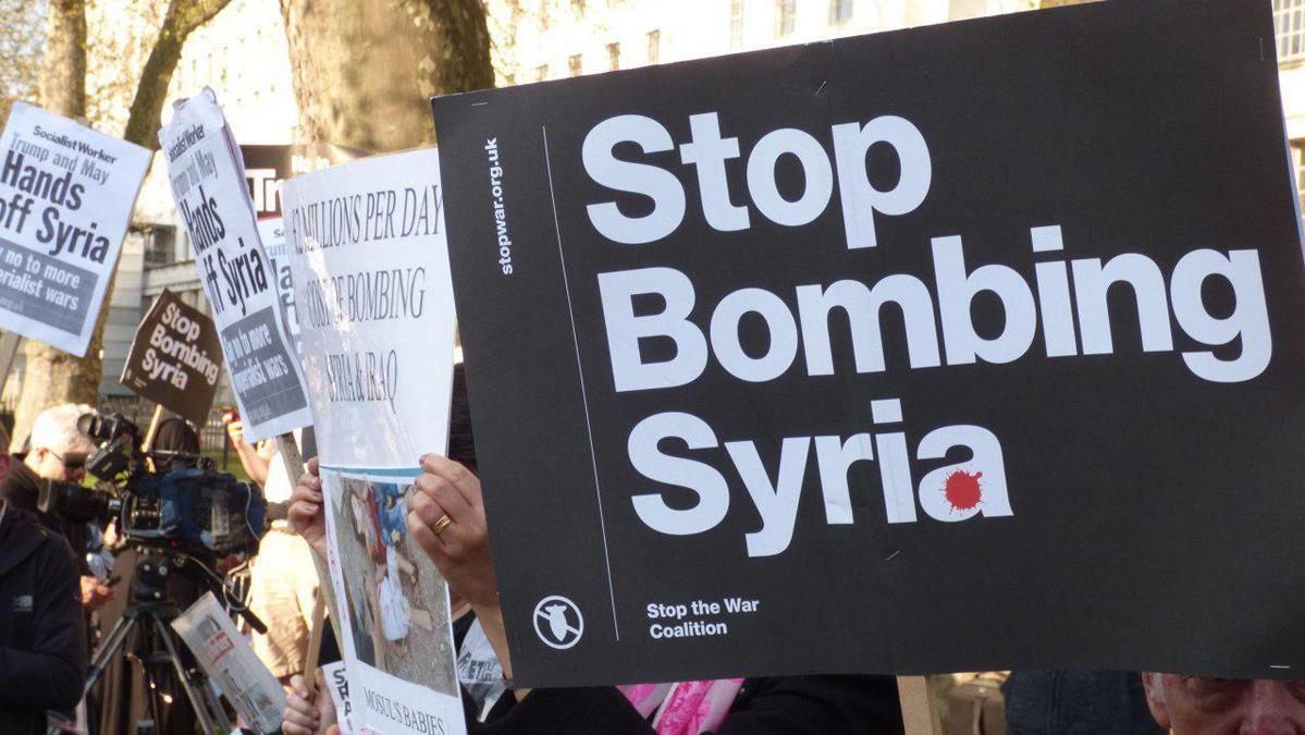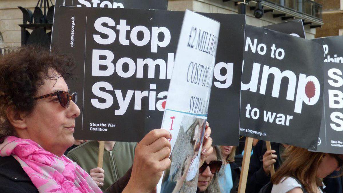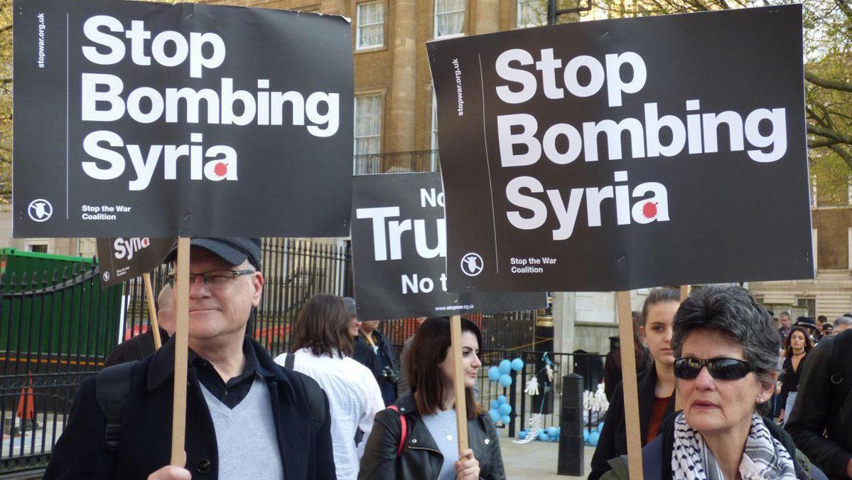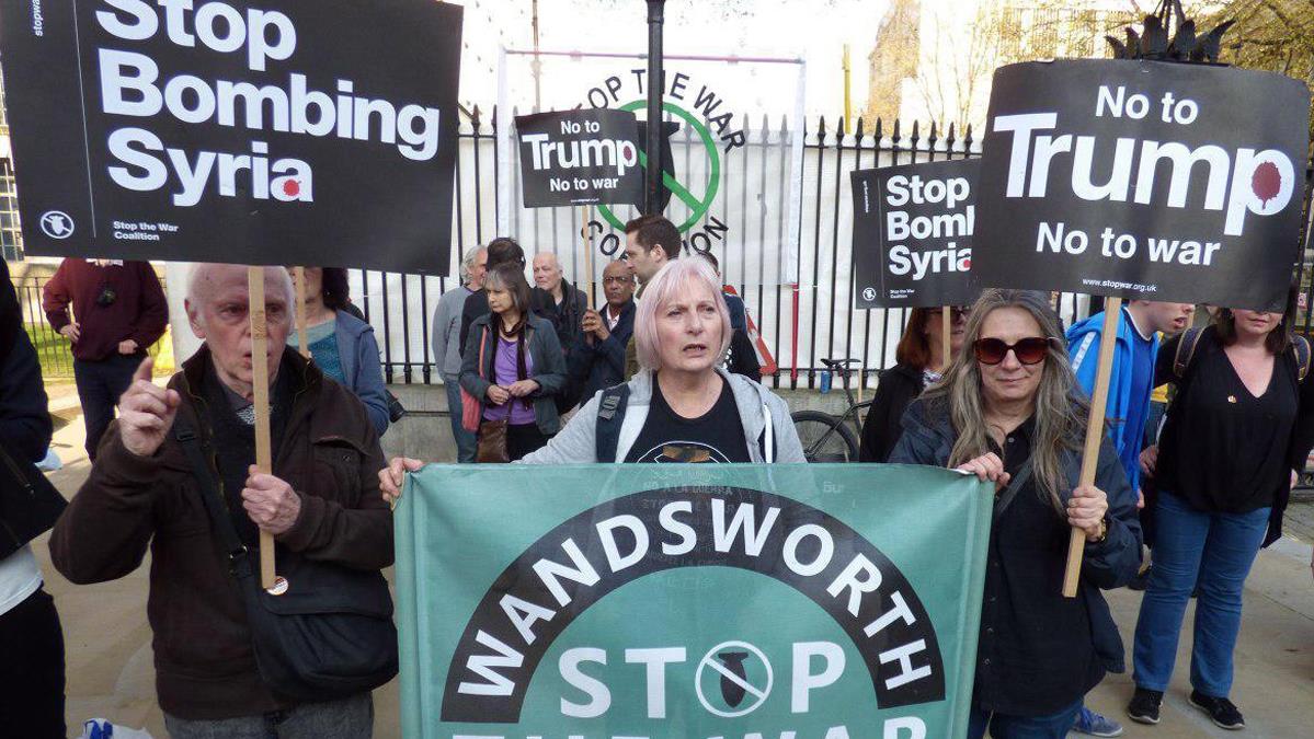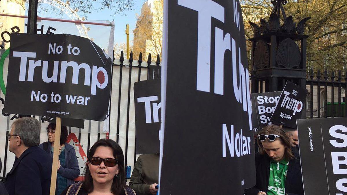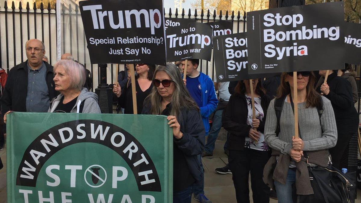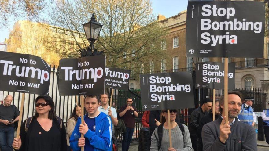 Los manifestantes concentrados frente a la residencia de la primera ministra británica, Theresa May, en la capital, han coreado consignas contra la política agresiva del presidente estadounidense, Donald Trump, llevando pancartas en las que se llamaba a parar los bombardeos contra Siria.