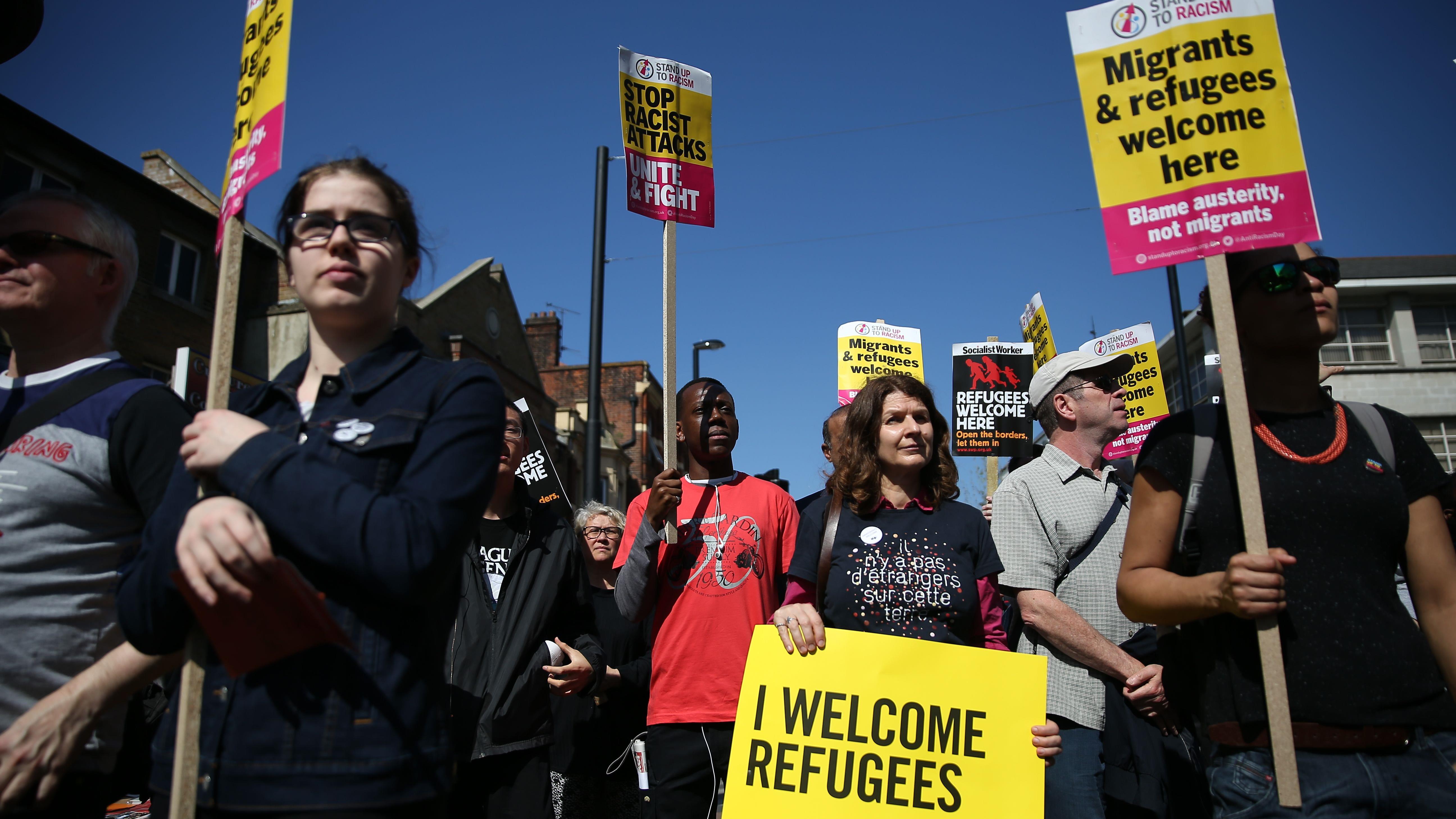Los participantes llevaban pancartas con la leyenda: "Refugees welcome here" (Refugiados bienvenidos aquí).