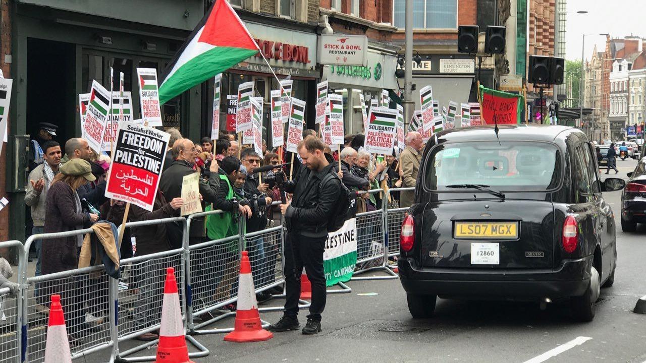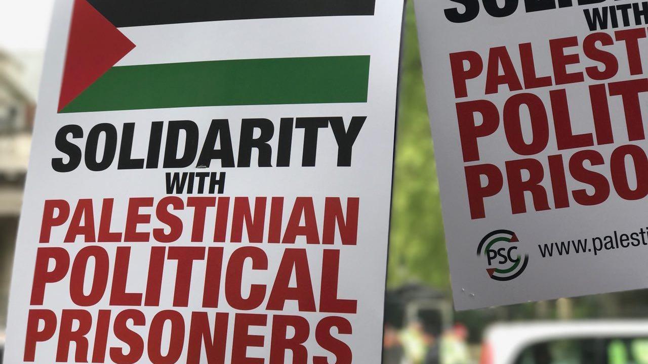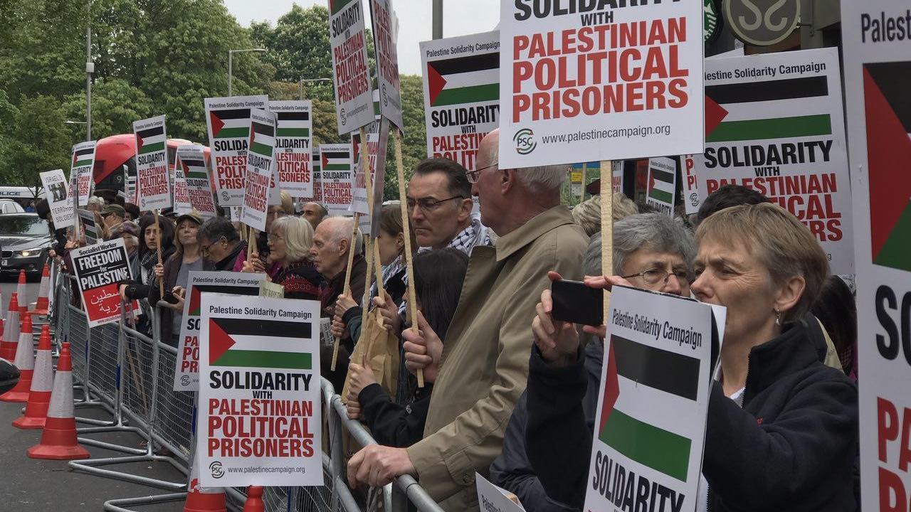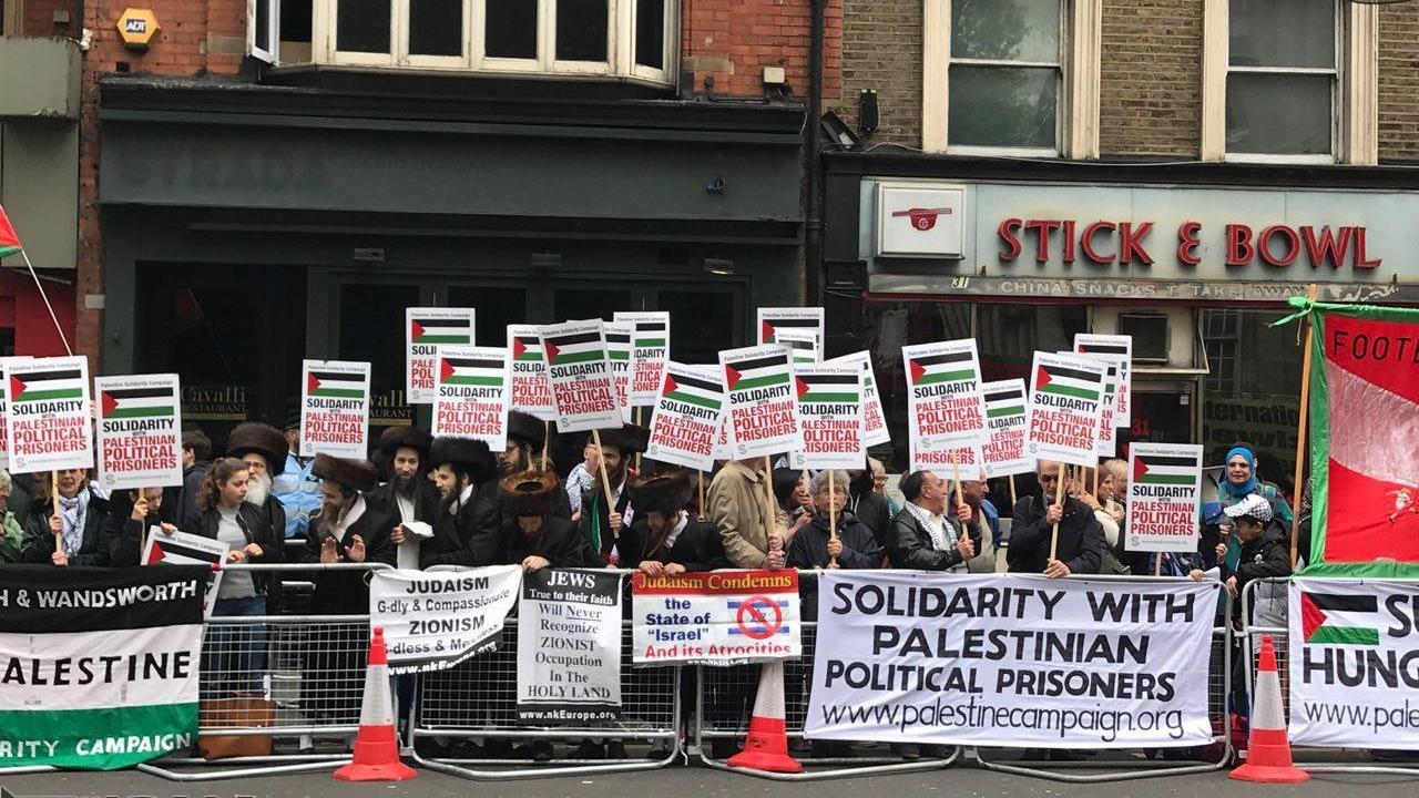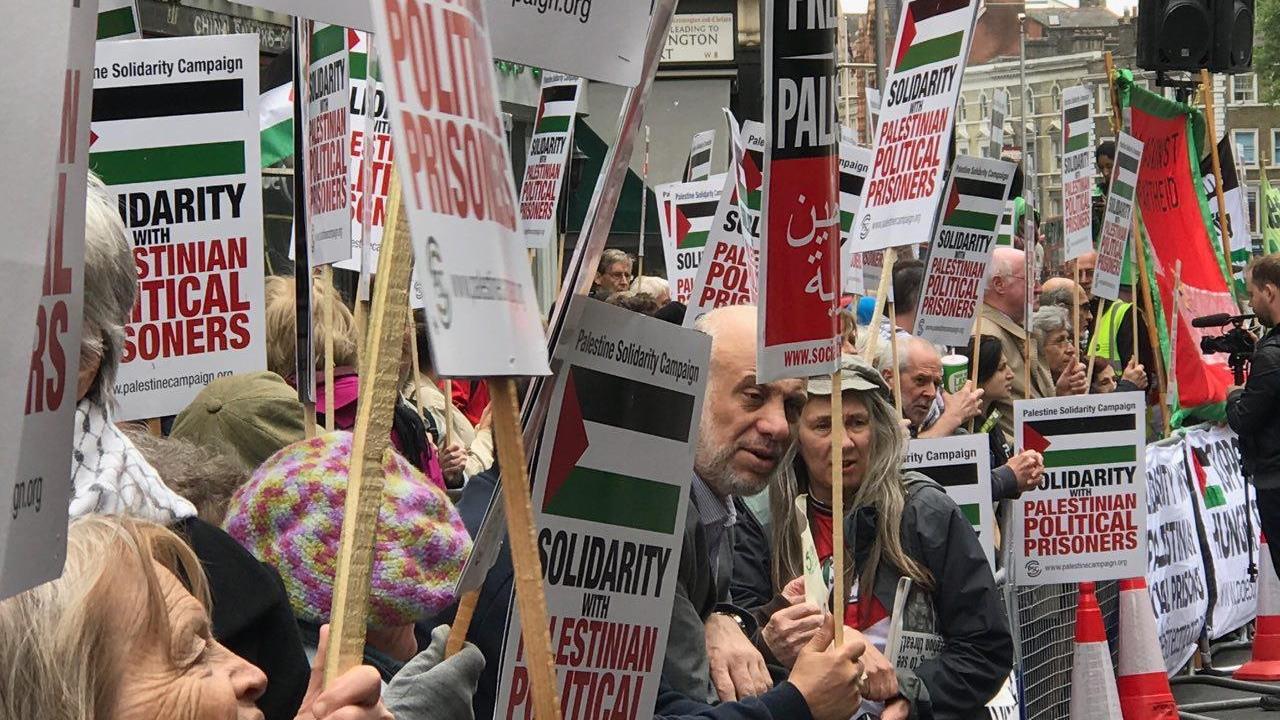 Los activistas, entre ellos judíos antisionistas, portaron pancartas con lemas, como "Solidaridad con los presos palestinos” o “Libertad para todos los palestinos” mientras clamaban consignas antisraelíes en la capital británica, Londres, en apoyo a los reclusos palestinos en huelga de hambre en las cárceles del régimen de Tel Aviv debido a las pésimas condiciones de vida que sufren en esos centros.