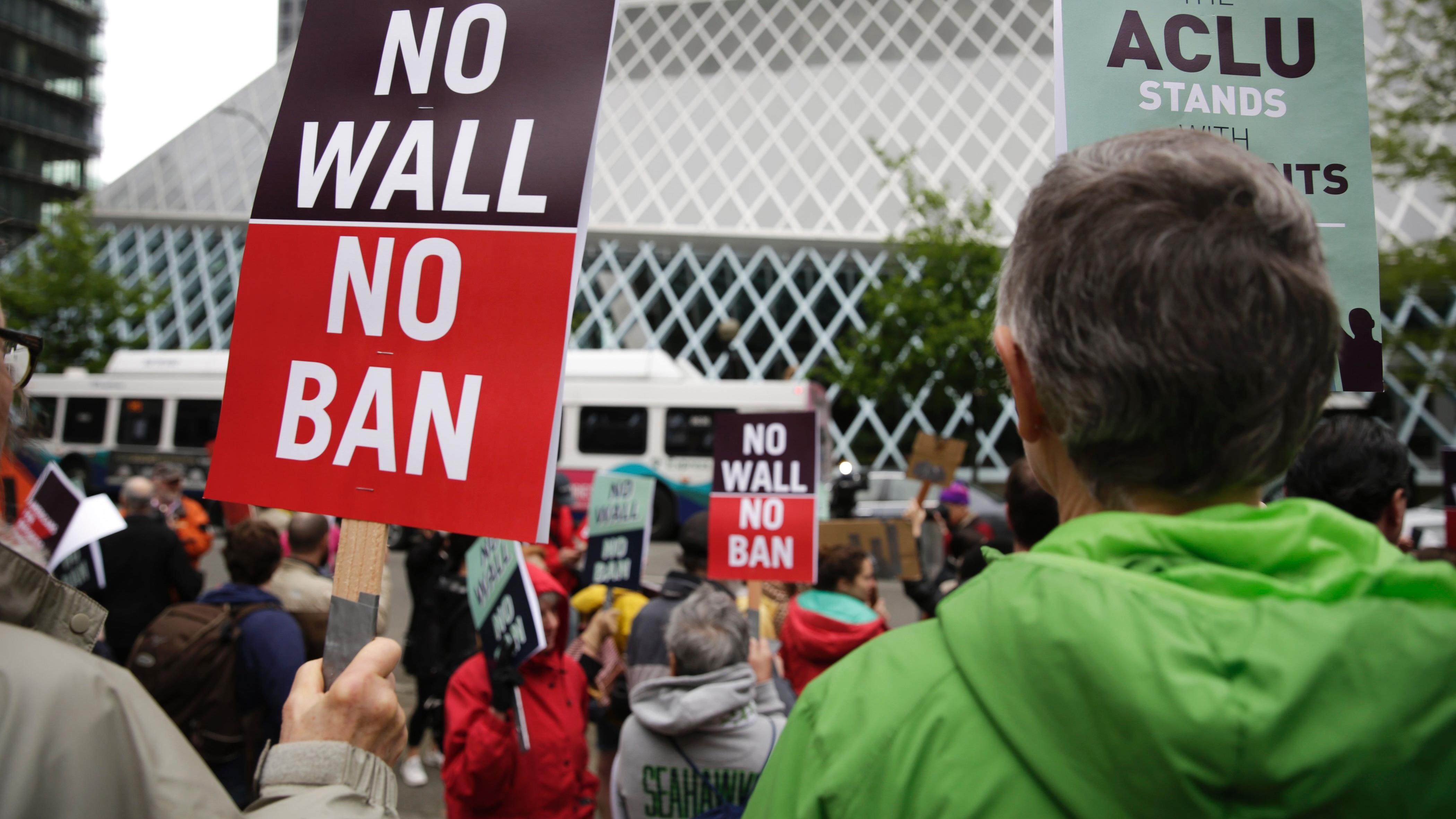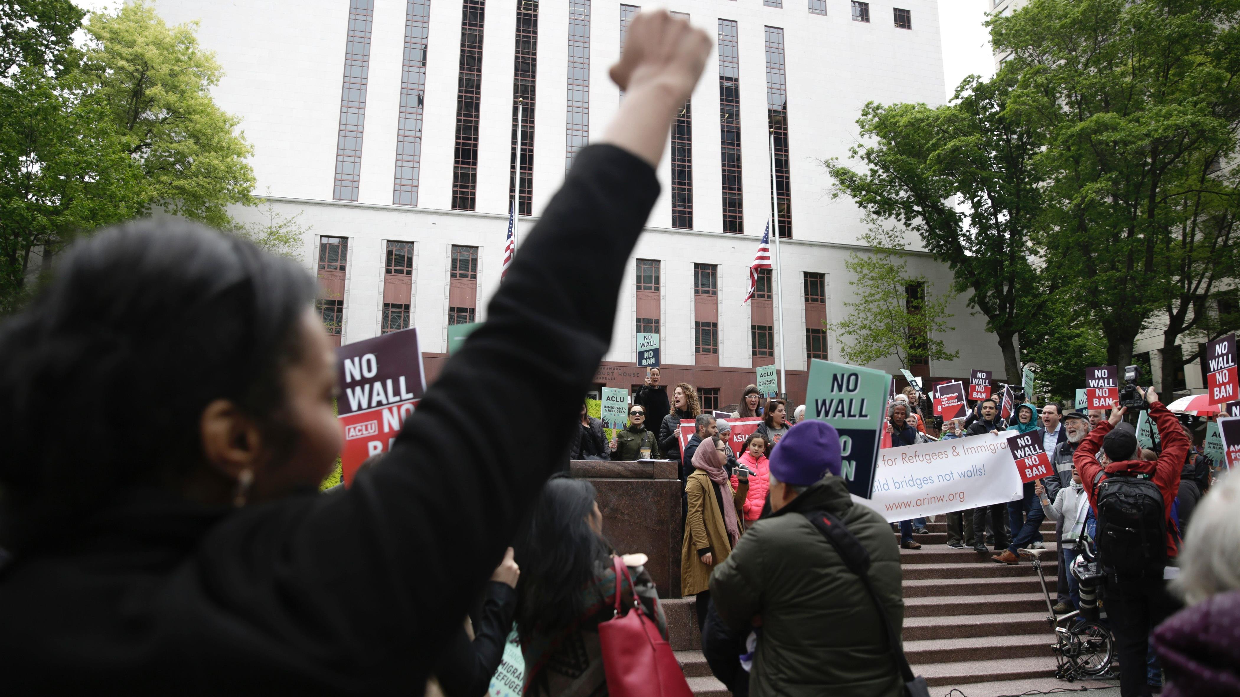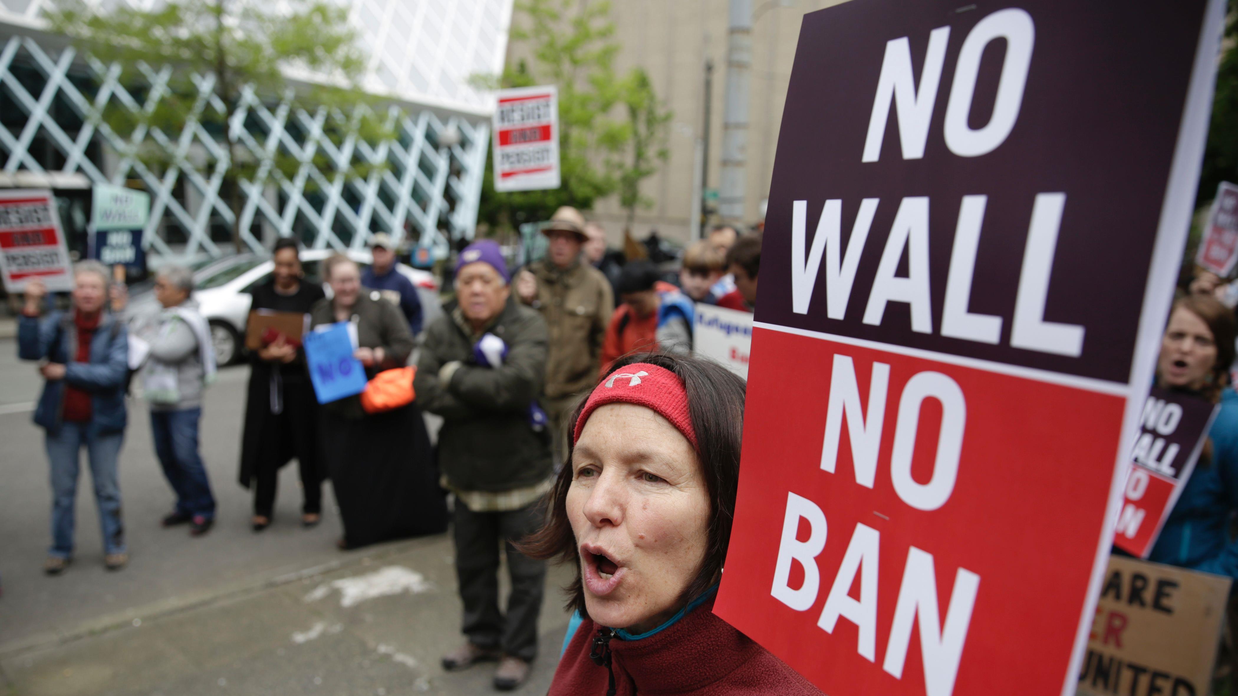 Los manifestantes realizaron su protesta cerca de una hora antes de que un panel de tres jueces del Noveno Circuito de la Corte de Apelaciones escuchara los argumentos del Gobierno de Donald Trump, que defendía su controvertido decreto antimigratorio.