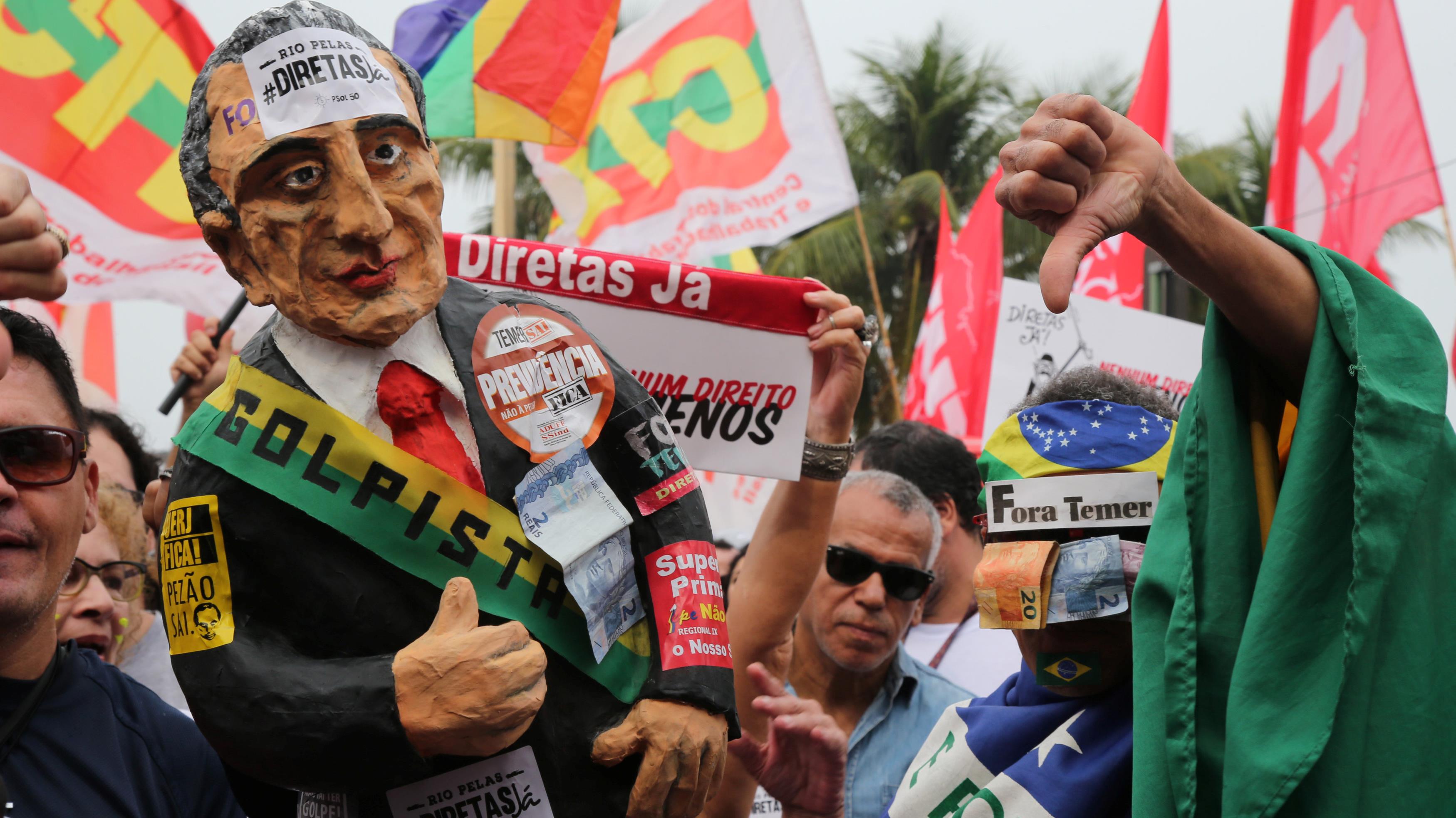Acompañados de decenas de artistas e intelectuales, los manifestantes repudiaron al mandatario Temer por estar envuelto en escándalos de corrupción y pidieron que deje el poder para celebrar elecciones directas.