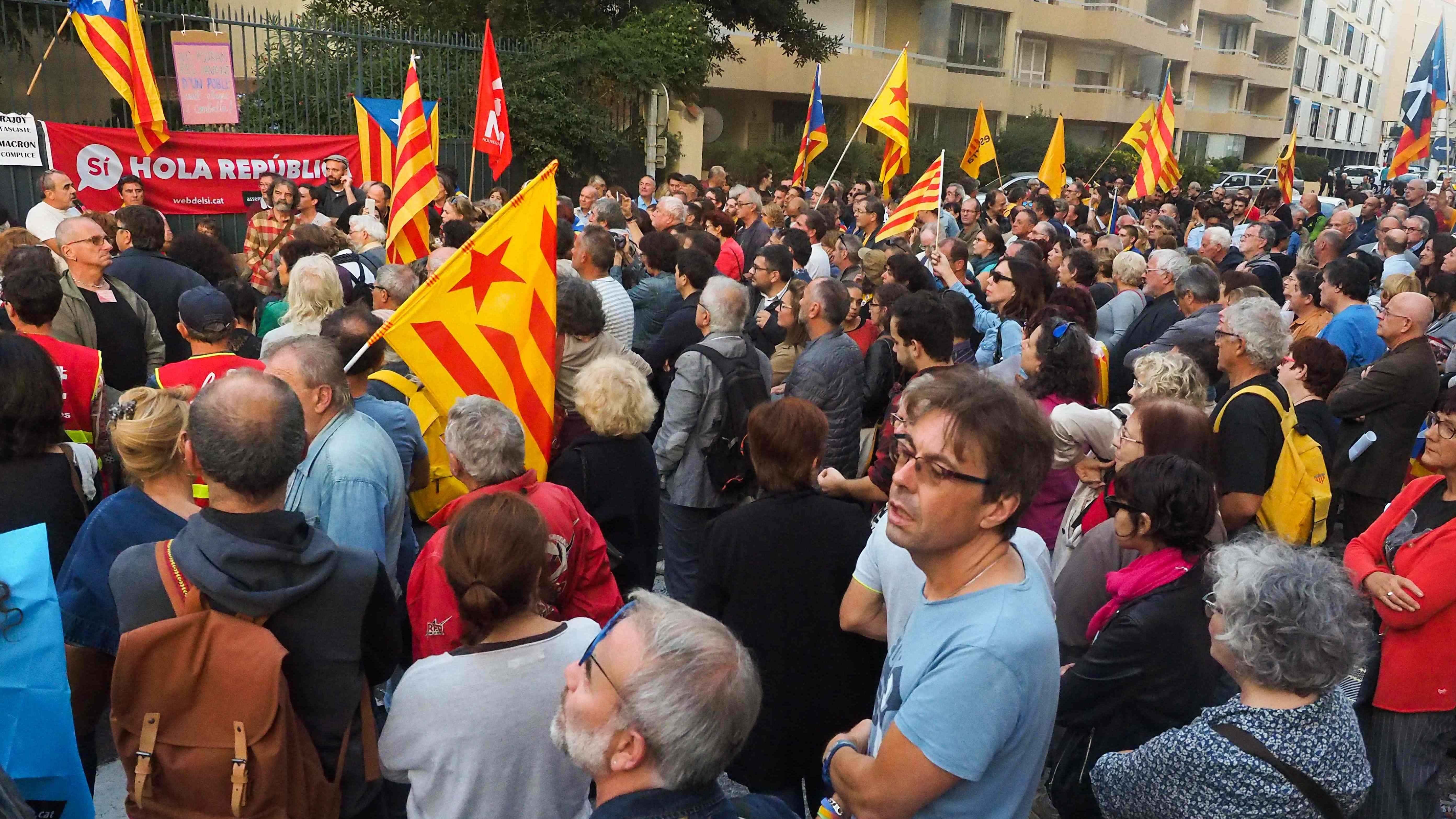Los manifestantes se congregaron en la Vía Laietana a las puertas de la Jefatura Superior de Policía Nacional de Cataluña en señal de protesta por las cargas de la Policía y la Guardia Civil durante la celebración del referéndum independentista, el 1 de octubre