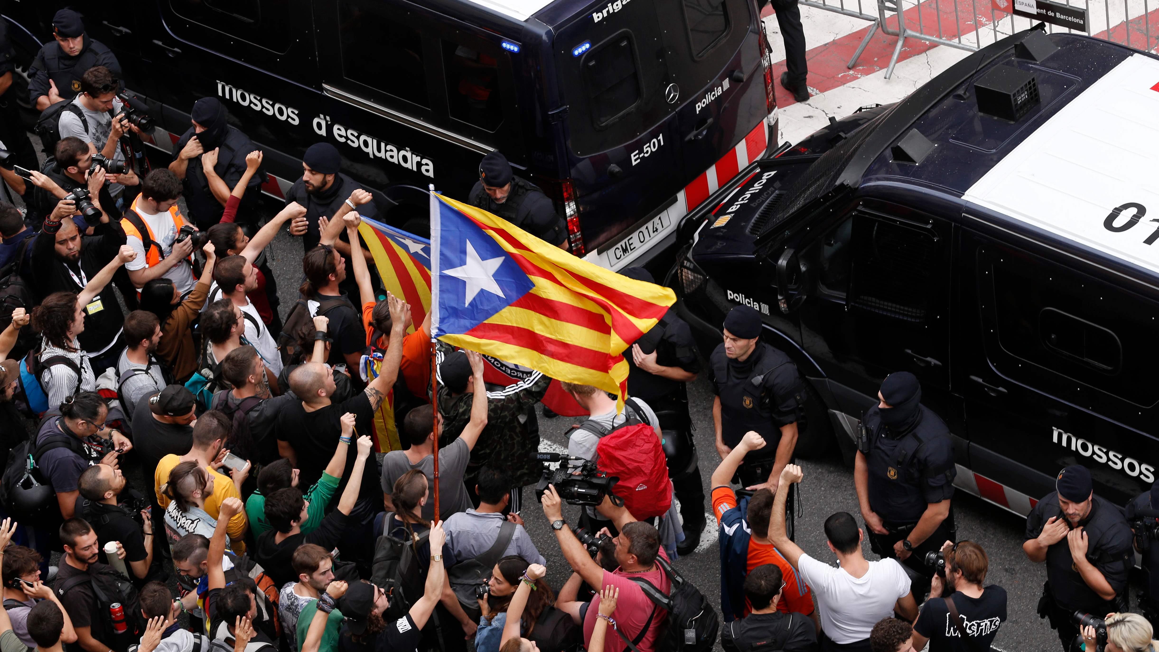 Las furgonetas de los Mossos d’Esquadra (Policía autónoma), con agentes, permanecieron estacionadas a modo de barrera ante el edificio policial para proteger la instalación, mientras que en las calles adyacentes había más vehículos de la propia Policía Nacional.