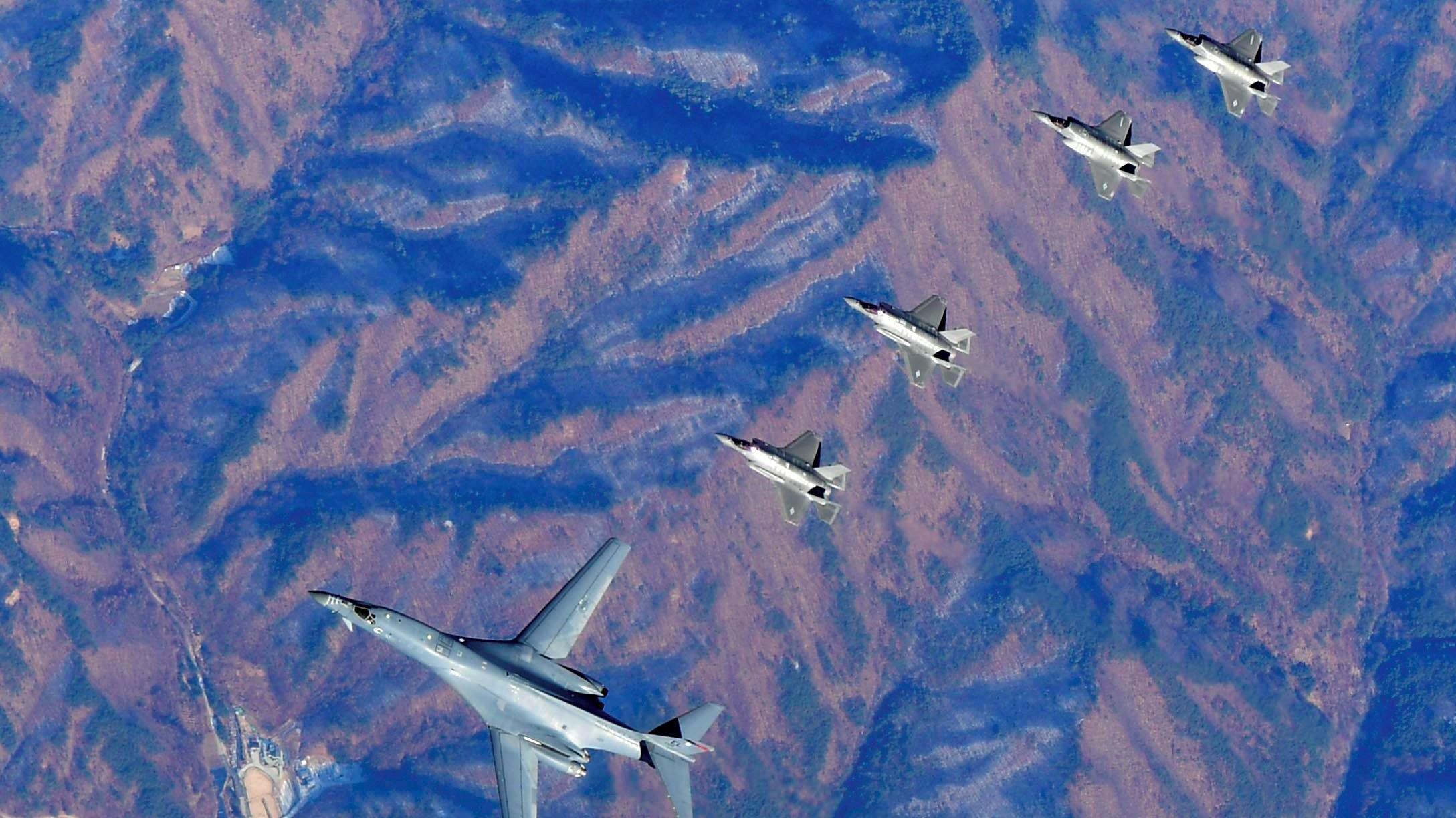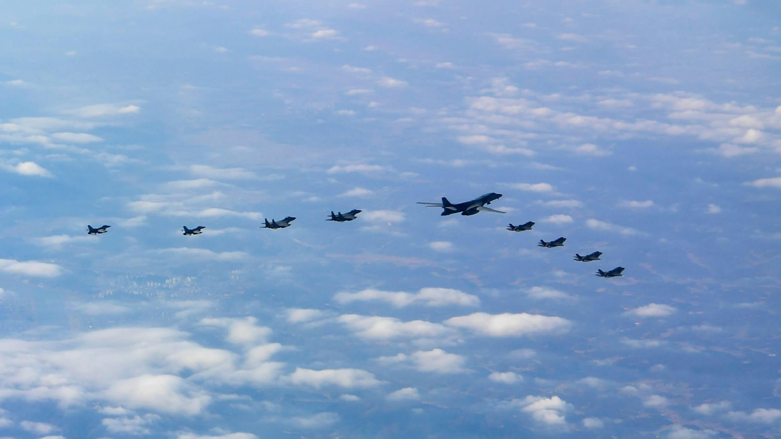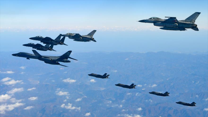 El Ministerio de Defensa de Corea del Sur en Seúl (capital surcoreana) ha publicado este miércoles las fotos que muestran los bombarderos B-1B Lancer, cazas F-35A y F-35B de la Fuerza Aérea de Estados Unidos volando sobre Corea del Sur con aviones de combate surcoreanos tipo F-16 y F-15K durante un simulacro militar conjunto.