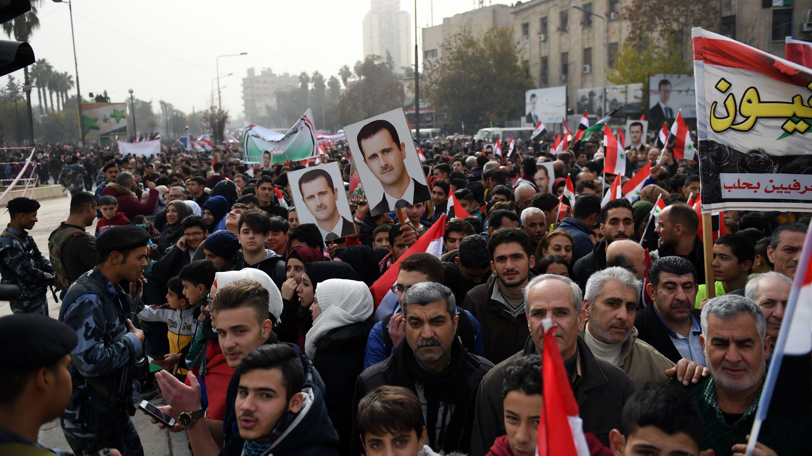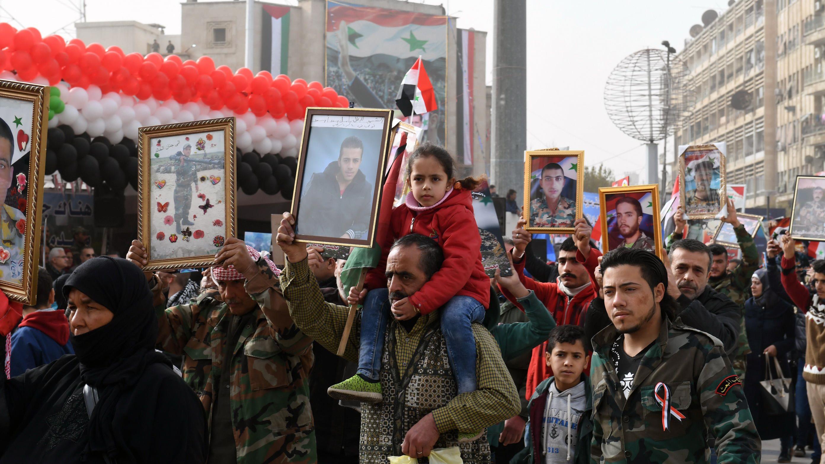 En el evento se han agitado banderas de la República Árabe Siria, a la vez que se mostraban fotografías de soldados caídos y se repartían dulces.