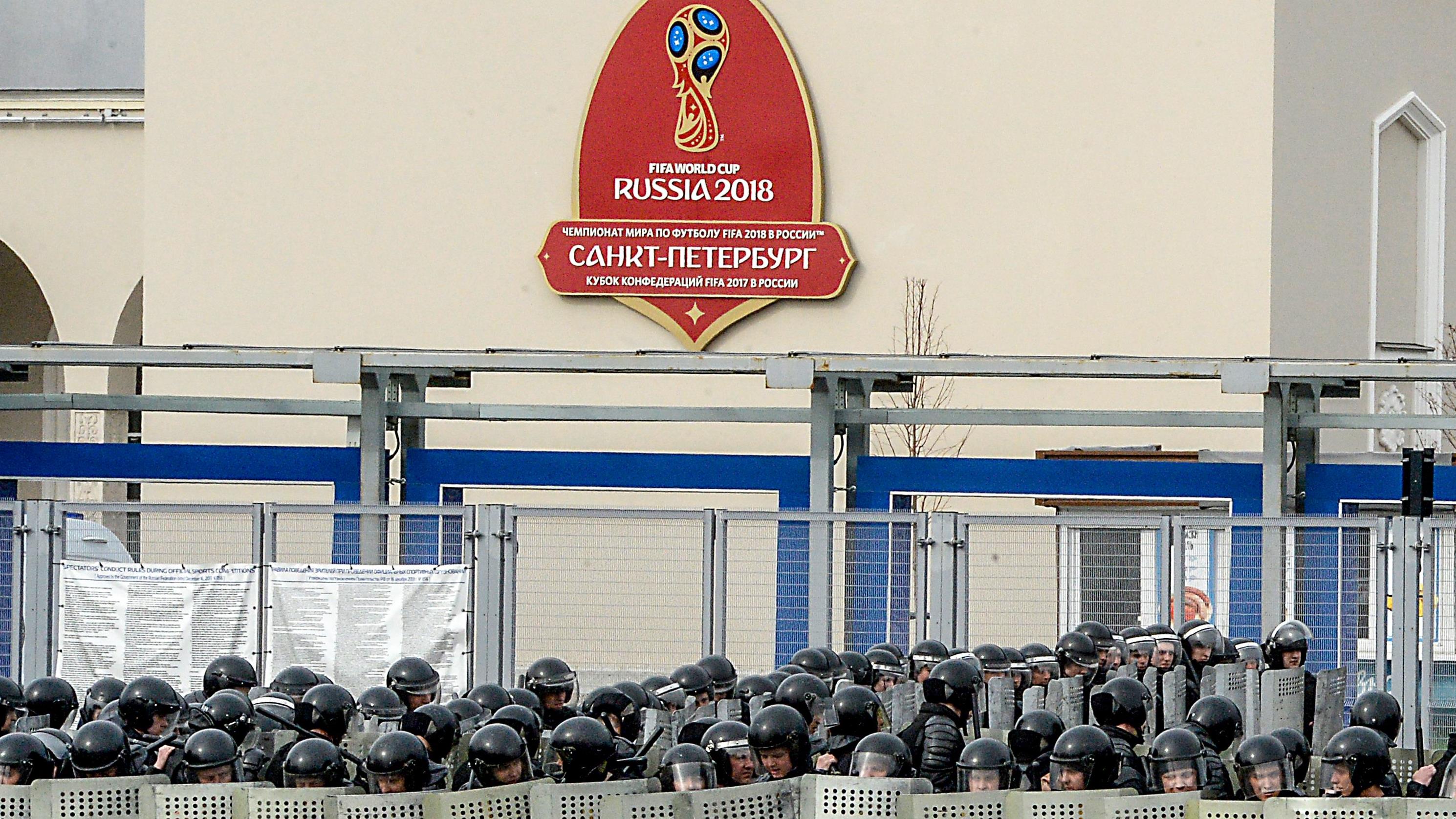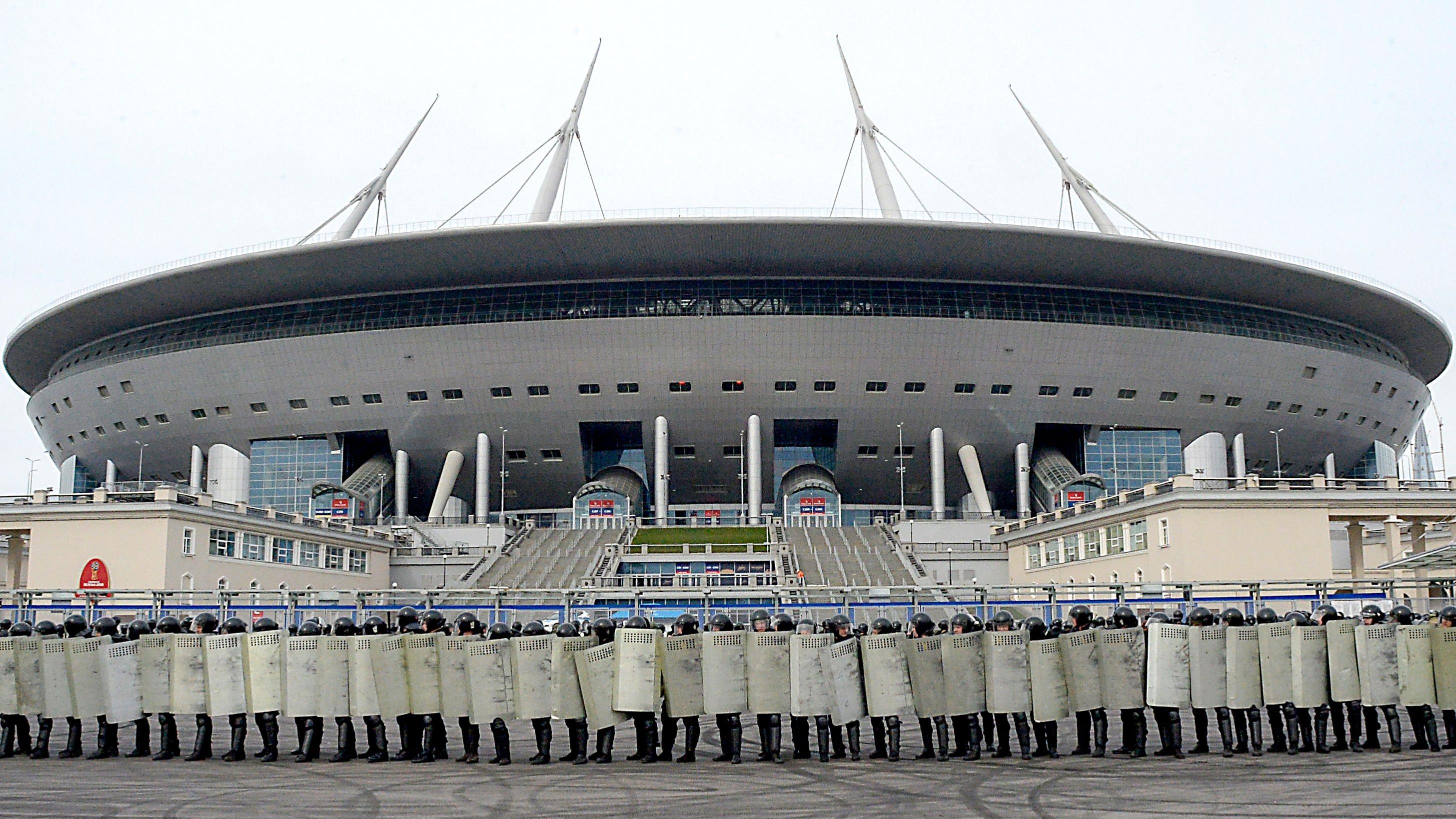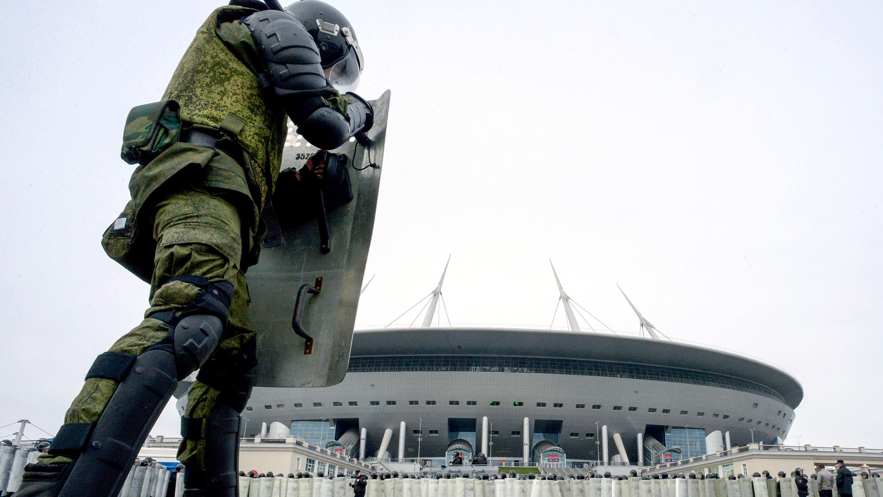 Los agentes realizaron simulacros equipándose con escudos antidisturbios y cascos negros con visores en el exterior del estadio Krestovsky, situado en la segunda ciudad más grande de Rusia después de Moscú (capital).