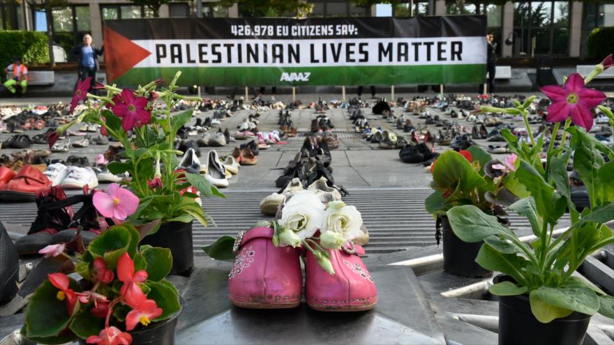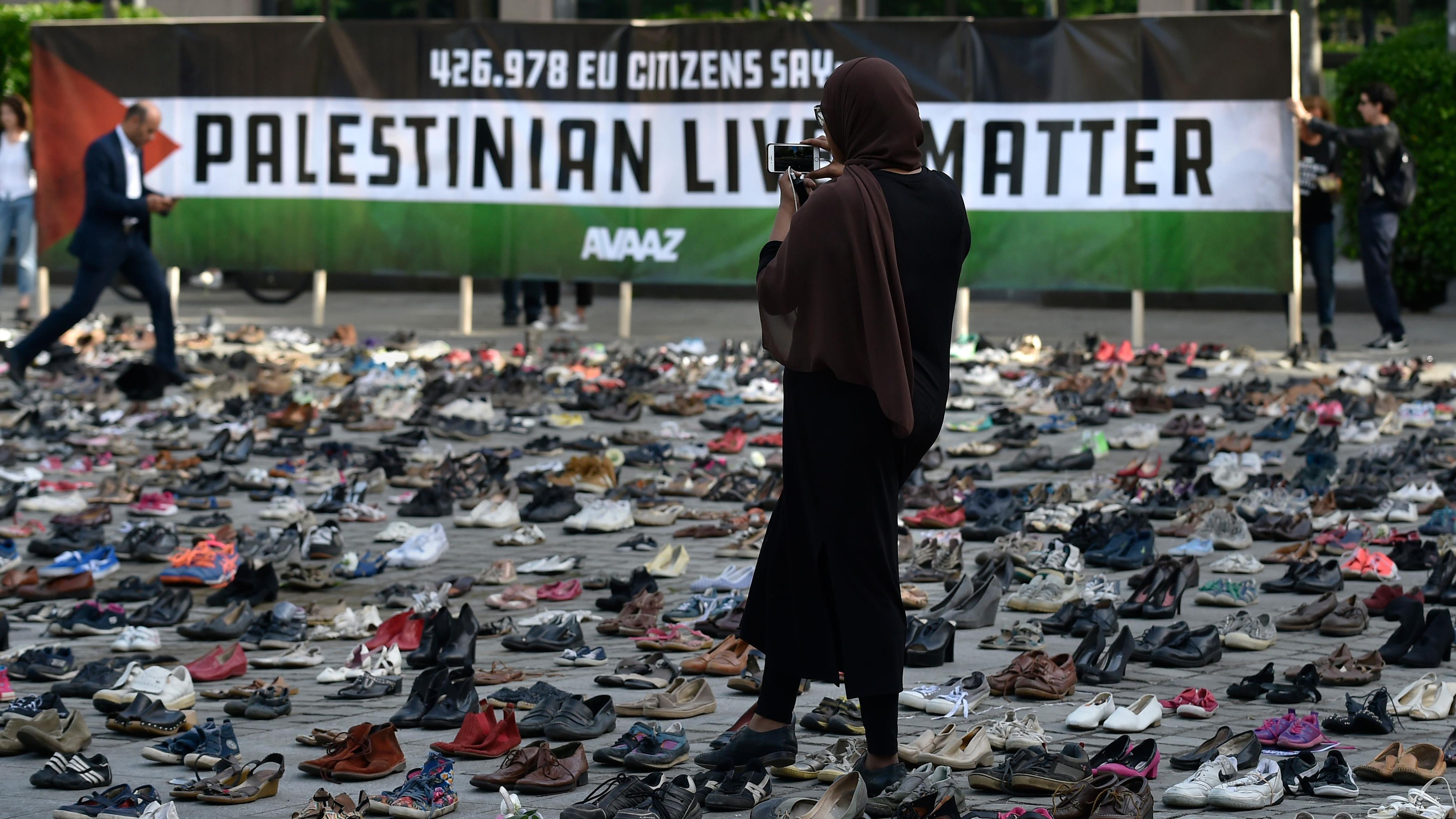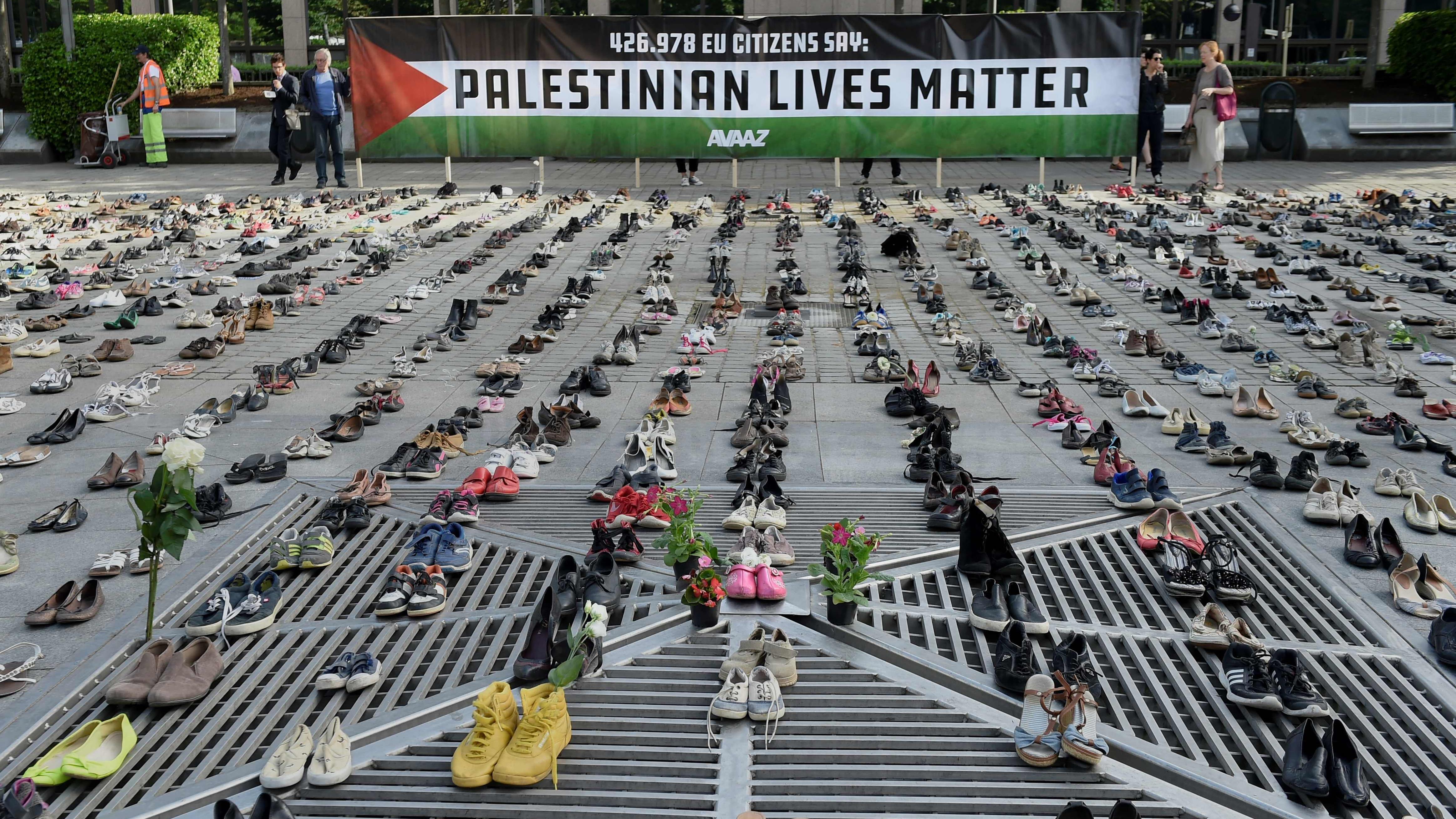 La instalación creada por la organización cívica Avaaz, coincidiendo con la reunión del Consejo de la Unión Europea (UE), incluye 4500 zapatos que representan todas las vidas perdidas en el conflicto palestino-israelí desde 2009.