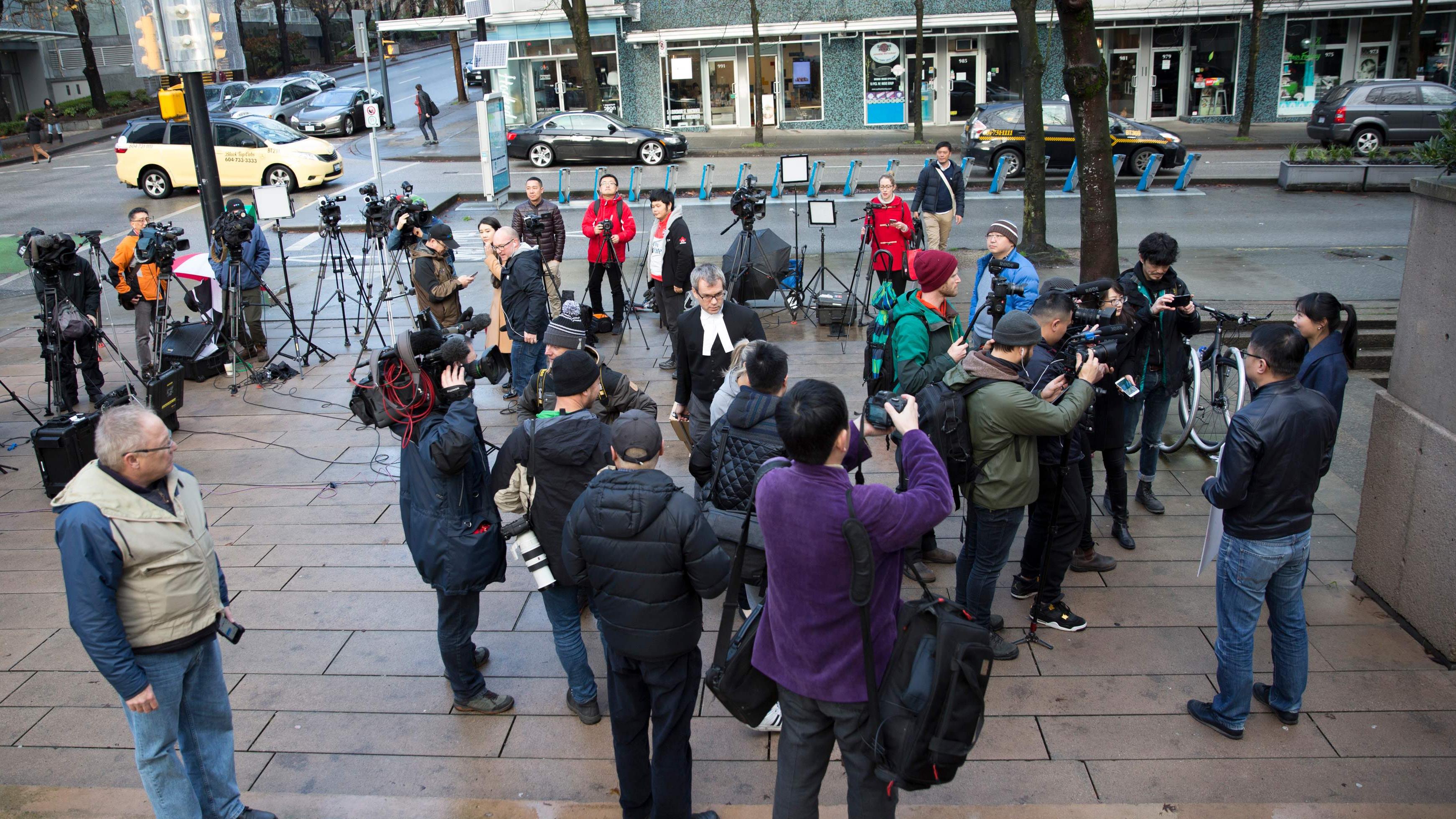 Los indignados se congregaron frente a la Corte Suprema de British Columbia portando pancartas en las que demandaban la puesta en libertad de la directora financiera de Huawei, Meng Wanzhou.