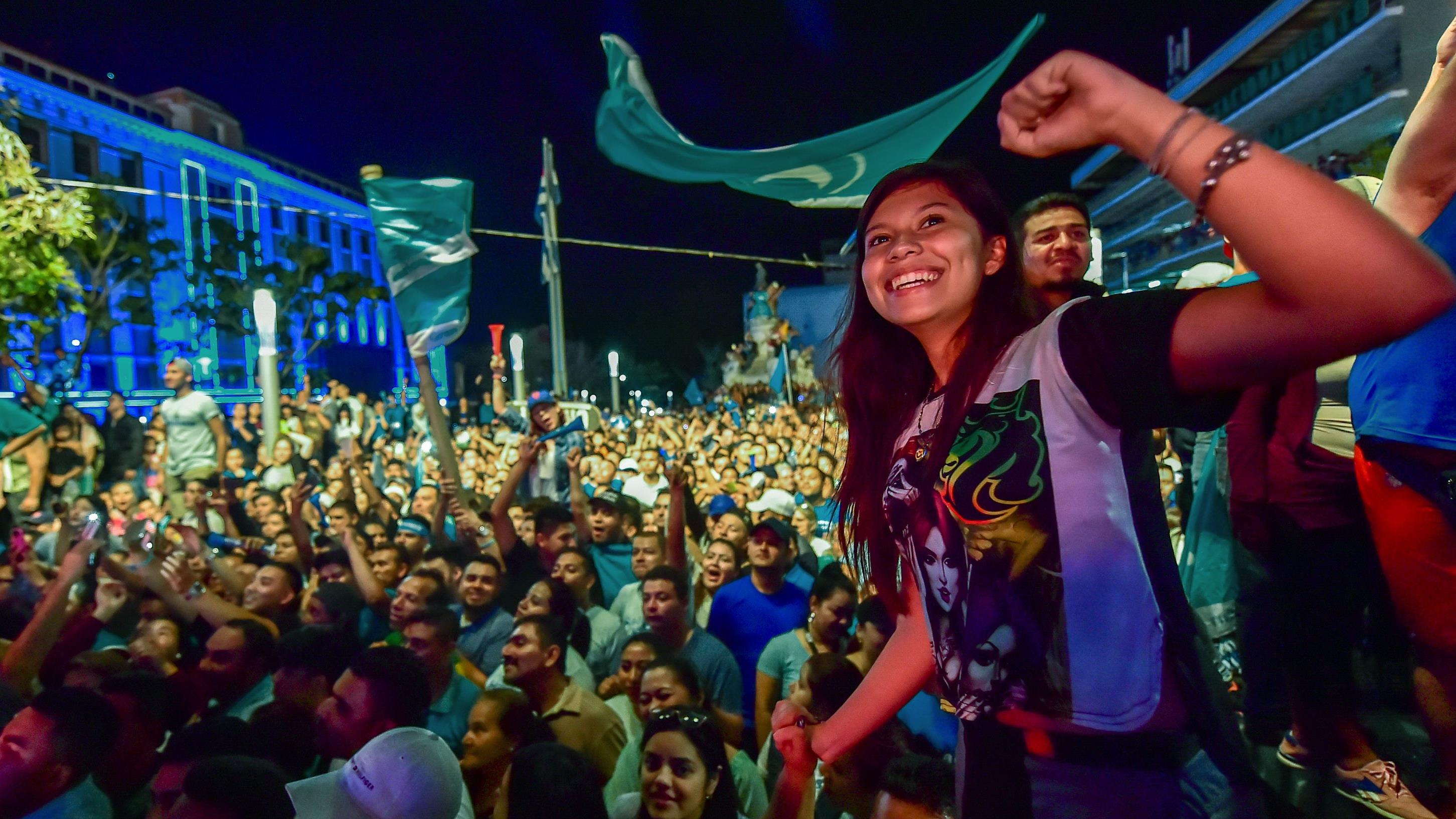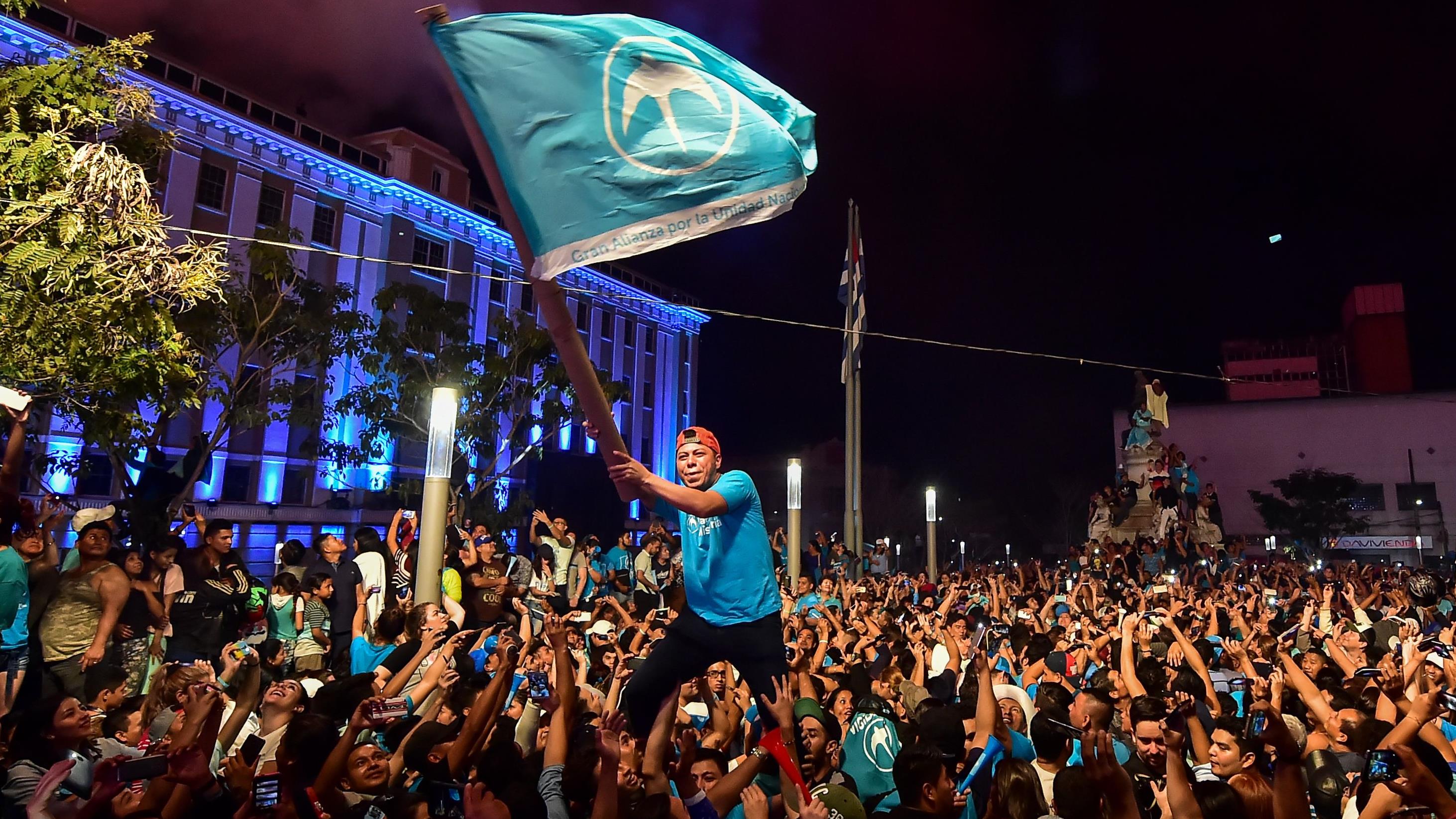 Partidarios del partido GANA celebran la victoria de su candidato Nayib Bukele en las elecciones presidenciales.
