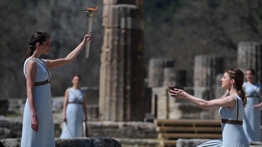 De pie frente a las ruinas del Templo de Hera de la antigua Olimpia, una actriz griega representando a una sacerdotisa pagana encendió la llama usando los rayos del sol reflejados en un espejo cóncavo, lanzando un relevo de antorcha de una semana de duración en Grecia antes de que la llama se entregue a los organizadores de Tokio el 19 de marzo.