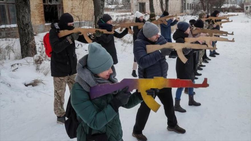 A medida que aumentan las tensiones entre Ucrania y Rusia con la intervención de Occidente, hombres y mujeres ucranianos realizaron prácticas con ametralladoras de madera y corrieron a través de caminos con obstáculos en un espacio abierto de una fábrica abandonada de Atek, en Kiev (capital).