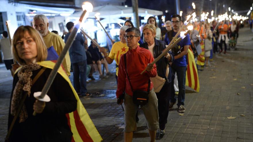 Los manifestantes en la víspera del Día Nacional de Cataluña (Diada) portan antorchas durante una movilización en la plaza del Foso de las Moreras, en la ciudad de Barcelona, a favor de su independencia de España. 10 de septiembre de 2015.