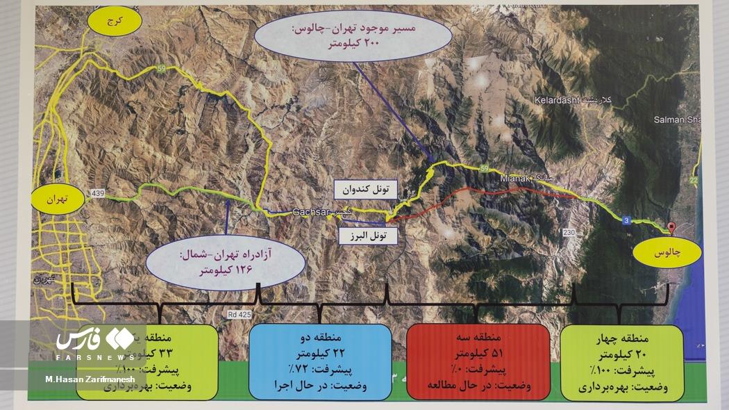La vía de acceso existente, la famosa carretera Teherán-Chalus (ciudad ubicada en la provincia norteña de Mazandaran), tiene una longitud aproximada de 200 kilómetros y está caraterizada por muchas curvas peligrosas, y por todo ello la nueva alternativa reducirá más de 3 horas el tiempo que tarda hasta llegar al destino.