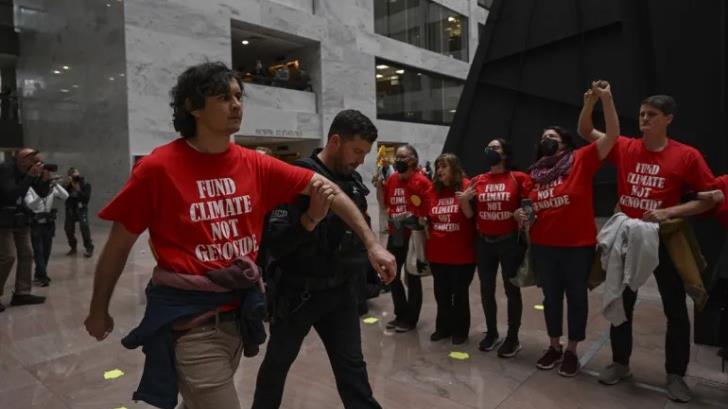 La gente llevaba camisetas y pancartas que decían: “Financie el clima, no el genocidio” y “Financie la vivienda, no el genocidio”.
