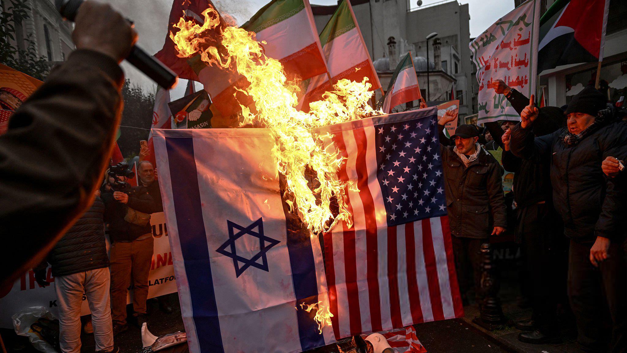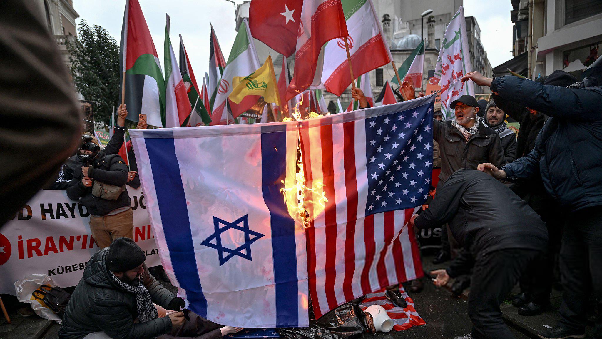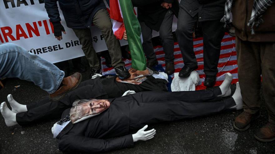 Manifestantes se concentraron el domingo frente al consulado iraní en Estambul, Turquía, donde pisotearon efigies de Donald Trump y Benjamín Netanyahu y quemaron banderas de Estados Unidos e Israel, en rechazo a los actos terroristas que apoyaron en contra de Irán el pasado 8 de enero. Los participantes portaban banderas de Irán y Palestina y expresaron su solidaridad con el pueblo persa.