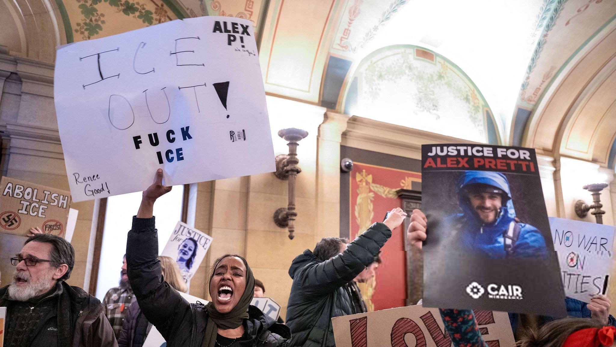 Los manifestantes condenaron los actos violentos del Servicio de Control de Inmigración y Aduanas (ICE, por sus siglas en inglés) de Estados Unidos; alzaron pancartas y gritaron consignas en contra de la presencia de ICE en Minnesota.