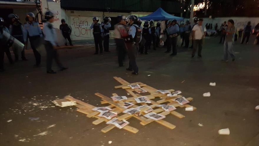 Los indignados llevaron tres ataúdes y varias cruces que simbolizaban las casi 40 personas que han muerto en las protestas que se llevan a cabo desde el 29 de noviembre contra la reelección de Hernández. Todos estos objetos fueron destrozados por los policías.