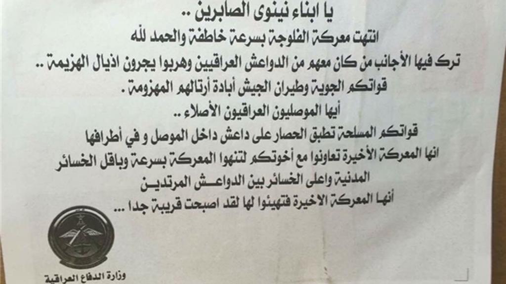 Según informan medios de comunicación iraquíes, los comunicados, sellados por el Ministerio de Defensa de Irak, pedían la cooperación del pueblo con las fuerzas iraquíes en las operaciones para la liberación de la ciudad.