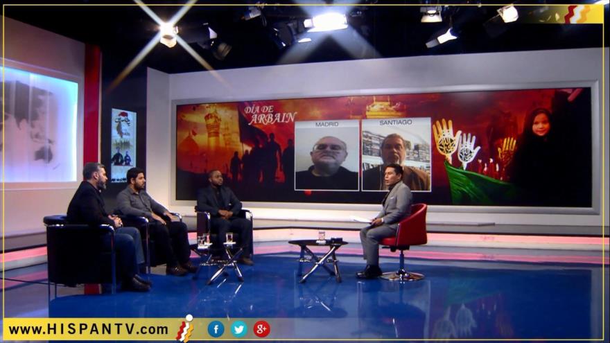 Los expertos en Asuntos Islámicos Cristian Abdulá Cerrilla, Ali Everton Regini y Yunus Riascos abordan el tema de Arbain desde los estudios de HispanTV en Teherán (capital de Irán).