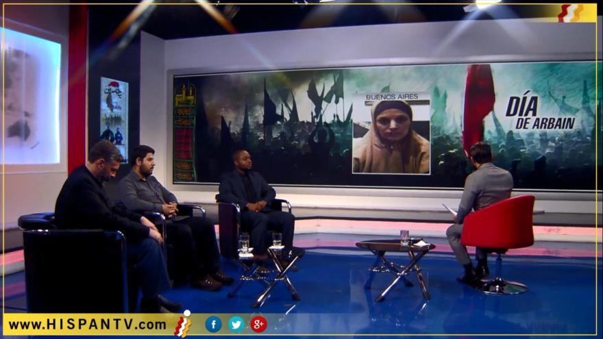 Los expertos en Asuntos Islámicos Cristian Abdulá Cerrilla, Ali Everton Regini Valeria Agustina Rodríguez y Yunus Riascos abordan el tema de Arbain desde los estudios de HispanTV en Teherán (capital de Irán).