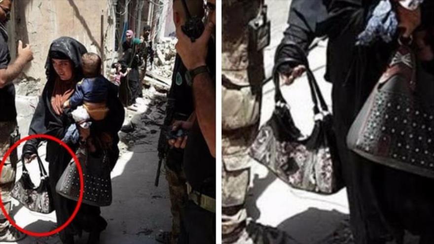 En primera instancia, la foto difundida por la televisión local Al-Mawsleya parece mostrar a una madre que sostiene un pequeño en los brazos mientras que huye de un barrio controlado por el grupo terrorista EIIL (Daesh, en árabe) en Mosul, pero con una mirada más detallada se nota que la mujer sostiene en la otra mano un gatillo, que lo detona poco después.