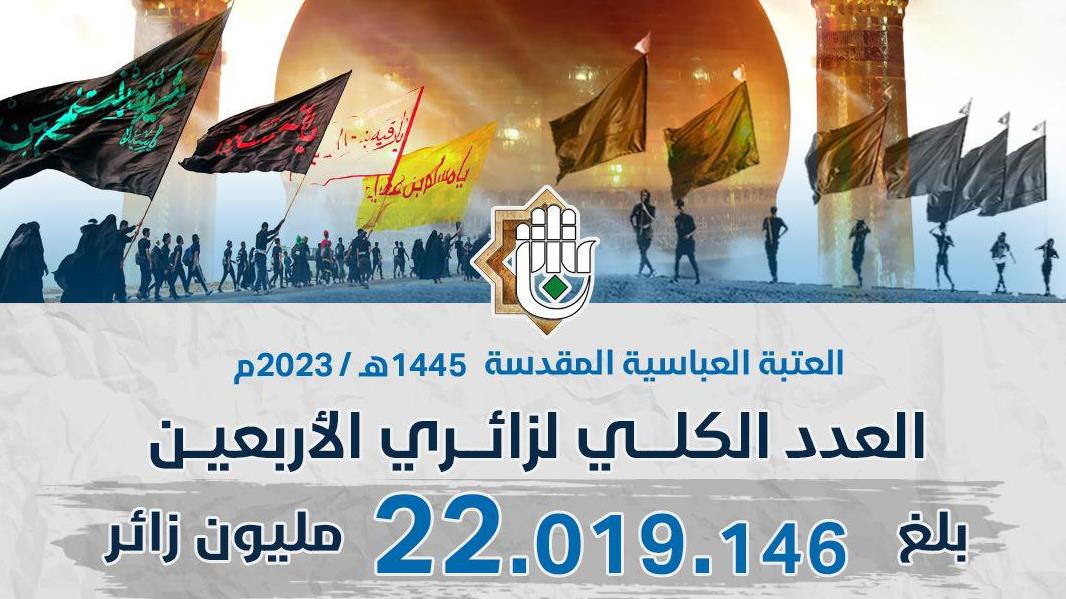 A través de un comunicado emitido el miércoles, la administración del mausoleo del Hazrat Abolfazl Abás (la paz sea con él) —hijo del primer Imam de los musulmanes chiíes, el Imam Ali (P) y el hermano del Imam Husein (P)—, informó que desde el primero del mes de Safar [segundo mes del calendario islámico de la hégira lunar que coincide con el 27 de agosto] hasta el 6 de septiembre, un total de 22 019 146 fieles ingresaron a la ciudad santa de Karbala, donde se encuentra la tumba del Imam Husein (P), para asistir a la ceremonia de Arbaín.