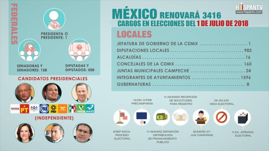 En la presente infografía les ofrecemos la información sobre los venideros comicios en México y los principales candidatos a la Presidencia, los cuales fueron nominados el domingo por los principales partidos políticos, como el Partido Acción Nacional (PAN), Partido de la Revolución Democrática (PRD), Partido Revolucionario Institucional (PRI), etc.