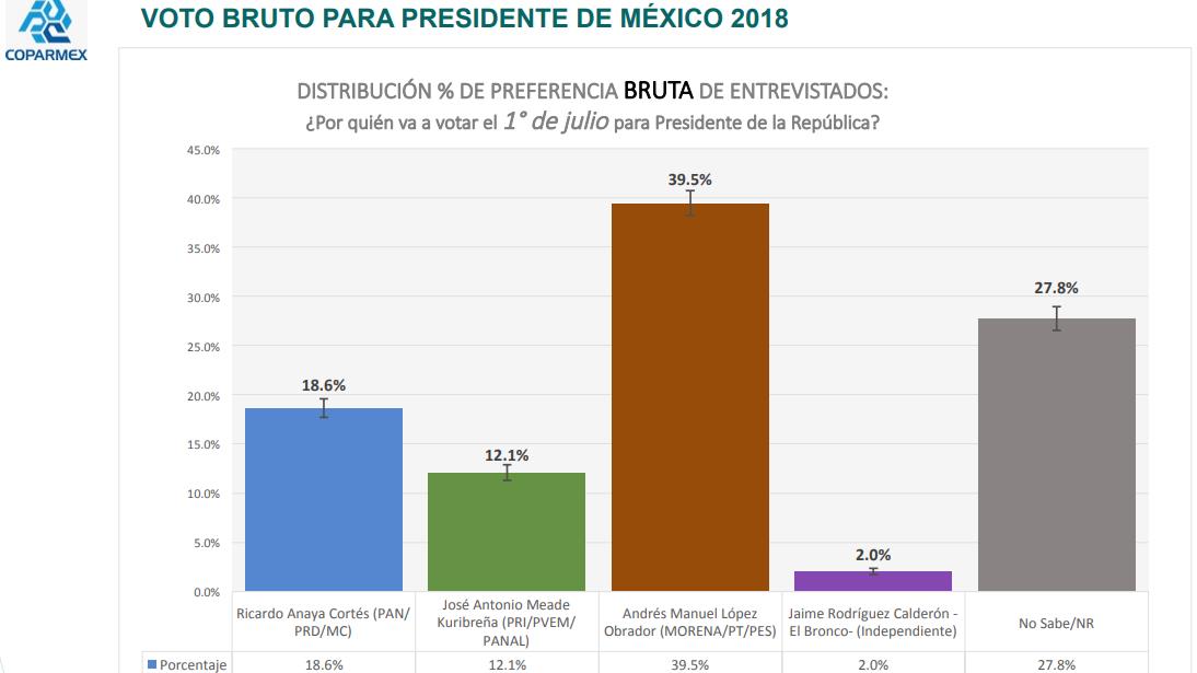 Por su parte, el presidente de la Coparmex, Gustavo de Hoyos, explica que, además de dichos resultados, el 27,8 % de los entrevistados no sabe a quién votar.