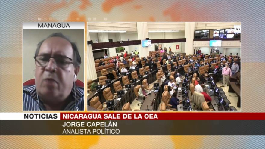 En una entrevista concedida este viernes a la cadena HispanTV, el analista político Jorge Capelán ha afirmado que la decisión del Gobierno de Nicaragua, presidido por Daniel Ortega, de iniciar de forma oficial el proceso de salida de la Organización de los Estados Americanos (OEA) por sus injerencias en los asuntos internos del país, “es un fracaso rotundo de la política exterior estadounidense”.