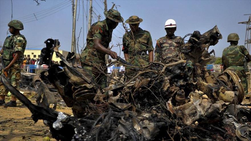 • Tropas nigerianas inspeccionan el lugar de un atentado de Boko Haram.
