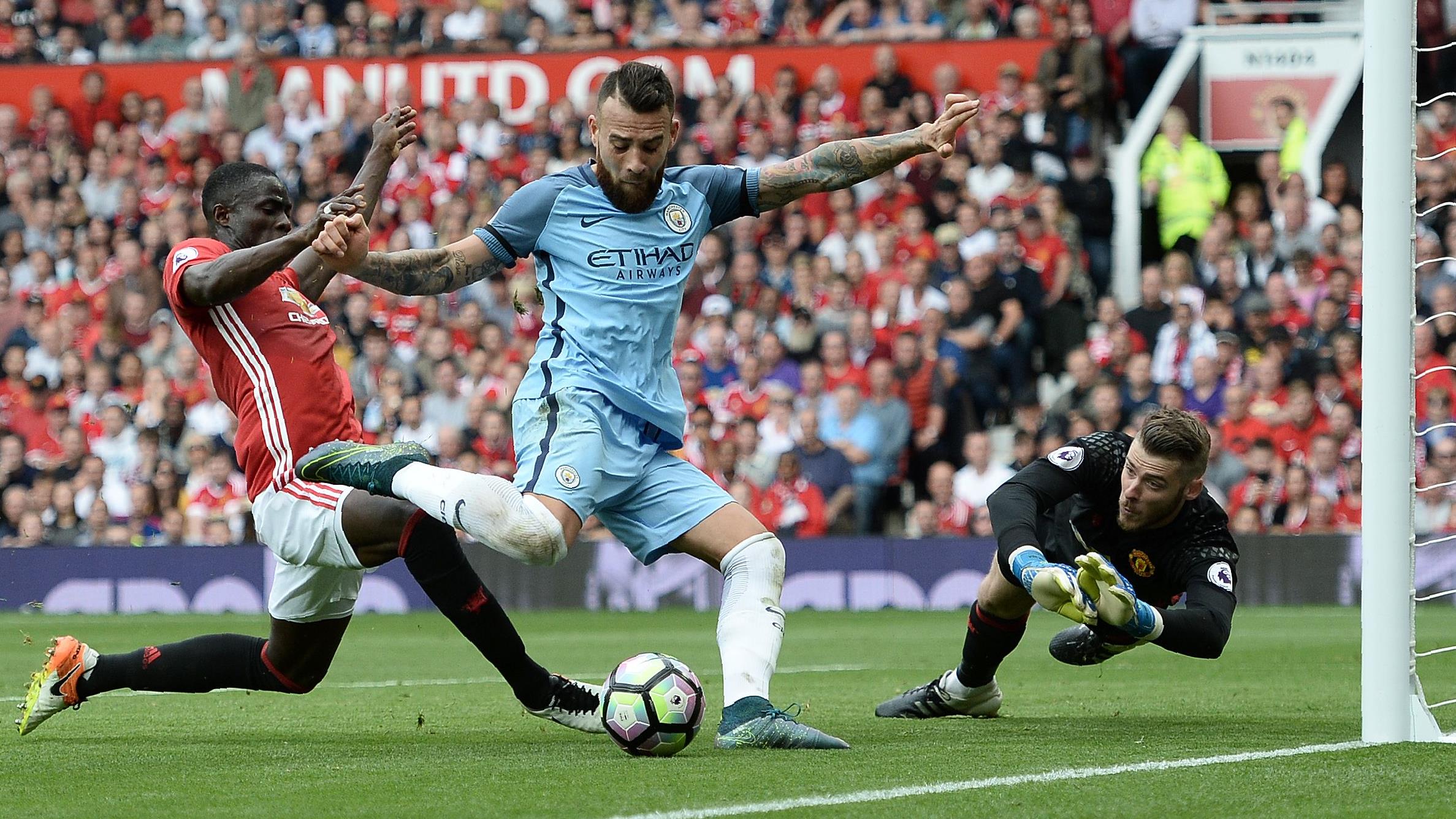 El jugador argentino de Manchester City, Nicolás Otamendi (centro), trata de disparar mientras el defensor y el portero de Manchester United, Eric Bailly (izda) y David de Gea (dcha), respectivamente, intentan pararlo. 10 de septiembre de 2016