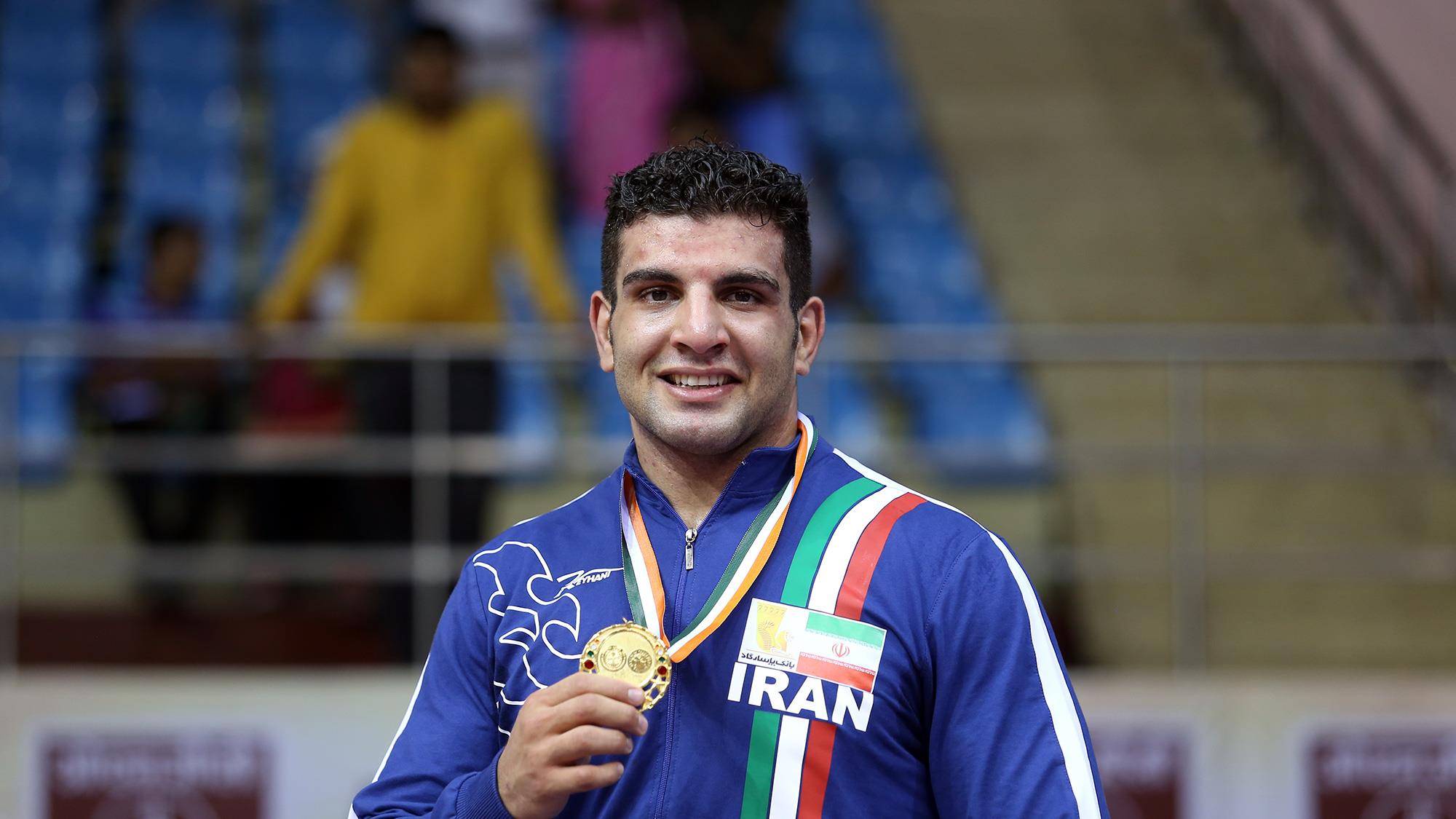 El luchador iraní de estilo libre Yadolá Mohebi posa con su medalla de oro tras ocupar el primer lugar en la categoría de peso de 125 kilos del Campeonato Asiático de Lucha en Nueva Delhi, La India, 14 de mayo de 2017.