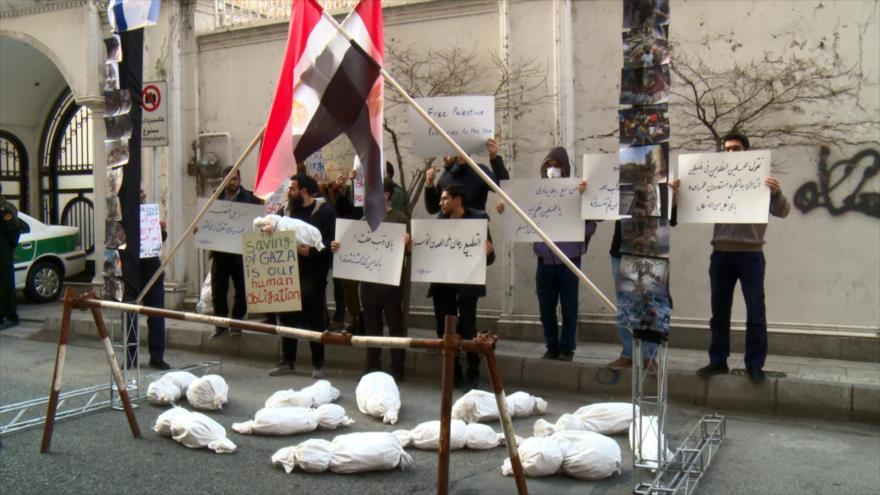 Se llevó a cabo una congregación en Teherán, ante la Sección de Intereses de Egipto en Irán, donde los manifestantes repudiaron al gobierno egipcio por mantener cerrado el paso de Rafah, fronterizo con la Franja de Gaza.no ser cómplice en el bloqueo del enclave.