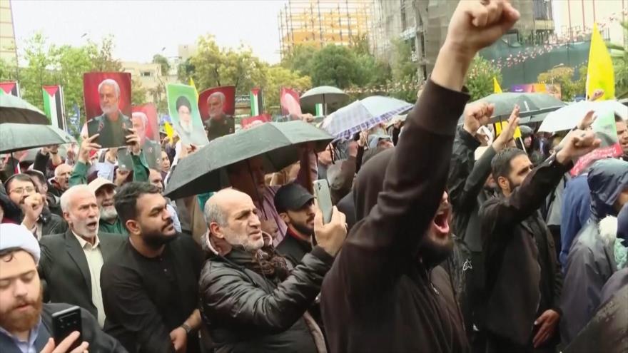 Pese a la fuerte lluvia, cientos de capitalinos se congregaron en una plaza céntrica de Teherán, portando banderas del Líbano, Hezbolá y Palestina, así como las fotos de Hasan Nasralá. En sus consignas, condenaron al régimen sionista, así como a EE.UU., ya que lo consideraron como un cómplice de las atrocidades israelíes
