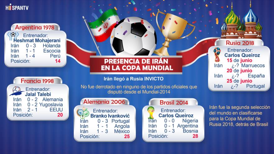 En su quinta presencia mundial, el equipo persa, que pertenece al Grupo B, jugará el 20 de junio en el estadio Kazán Arena contra España y el 25 de junio contra Portugal en el Mordovia Arena.
