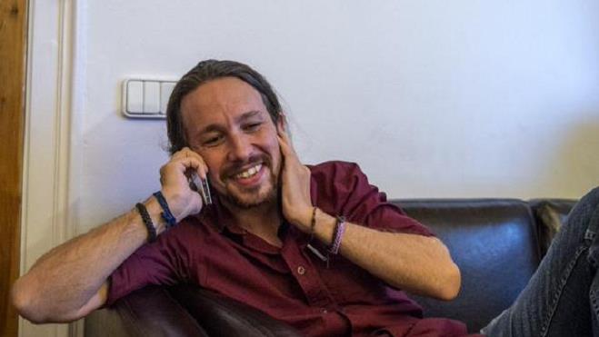 El líder del partido español Podemos, Pablo Iglesias, felicita por teléfono la victoria en las urnas al líder de la Coalición de la Izquierda Radical griega, Alexis Tsipras. 20 de septiembre de 2015.