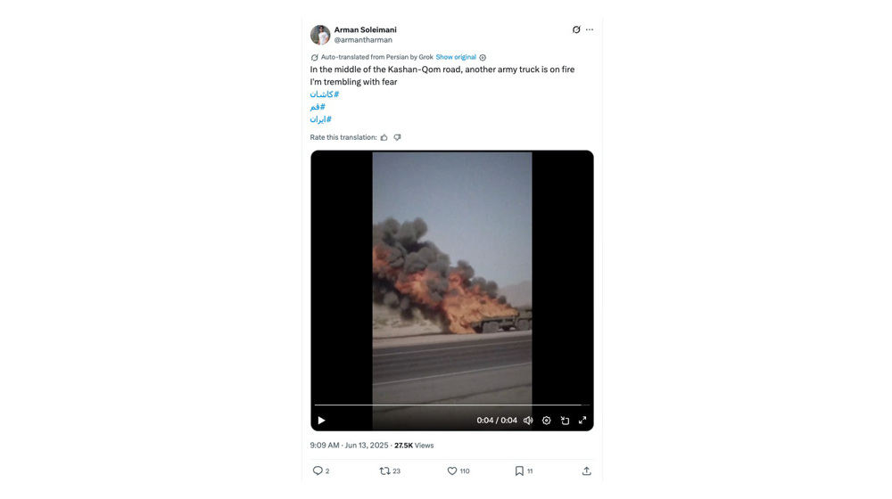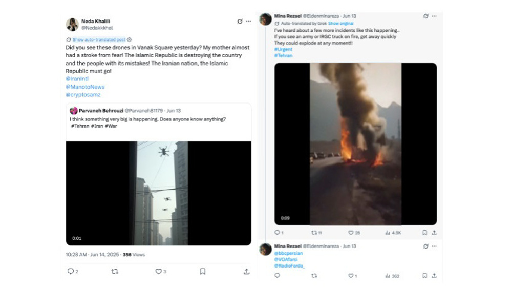 Desde el primer día del ataque israelí, el 13 de junio, la red comenzó a difundir vídeos que supuestamente mostraban explosiones de vehículos militares iraníes y protestas en todo el país.