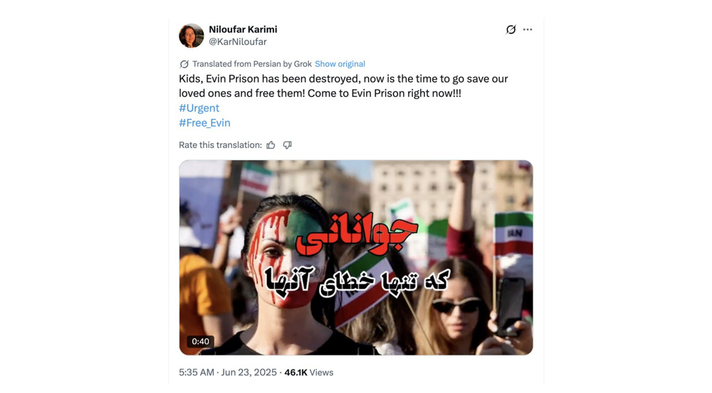 Otra cuenta, @KarNiloufar —la más antigua de la red— compartió un vídeo deepfake (manipulado para crear una falsificación realista) del ataque a la entrada de la prisión a las 12:05 p.m., mientras los ataques seguían en curso.