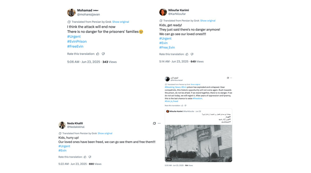 En otro intento por atraer la atención de medios convencionales, las cuentas de PRISONBREAK etiquetaban frecuentemente medios persas financiados por Occidente y hostiles a Irán, como BBC Persian, VOA Farsi e Iran International —plataformas que desde hace tiempo reproducen narrativas de guerra psicológica israelí.