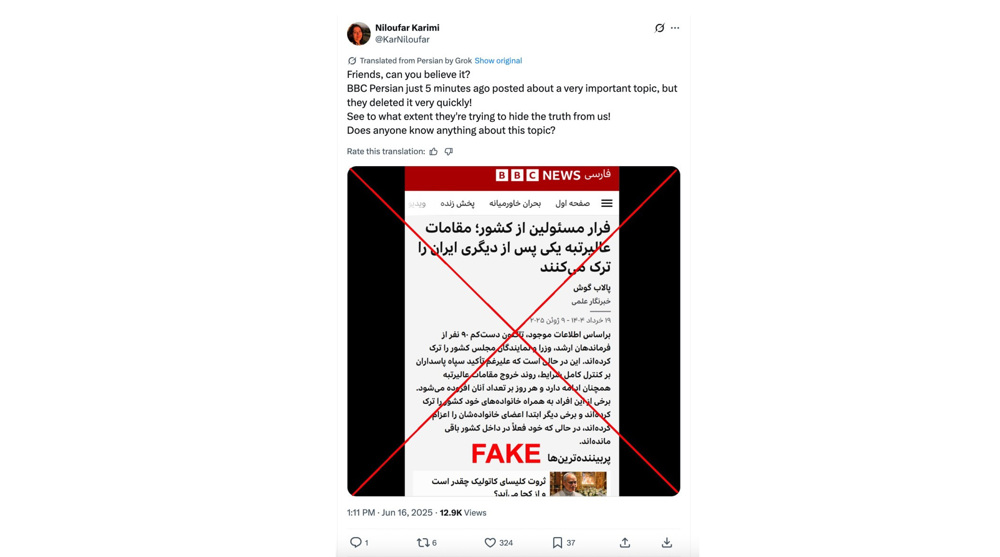 La publicación, compartida por la cuenta @KarNiloufar, afirmaba que BBC Persian había eliminado el artículo apenas cinco minutos después de haberlo publicado. El titular falsificado decía: “Funcionarios huyen del país; altos cargos abandonan Irán uno tras otro”.