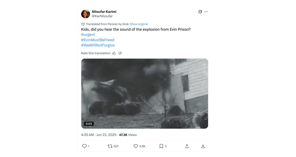 En menos de una hora desde la publicación del vídeo generado por IA que supuestamente mostraba el bombardeo a la entrada principal de la prisión de Evin, el usuario original, @KarNiloufar, compartió otra publicación con un nuevo vídeo.